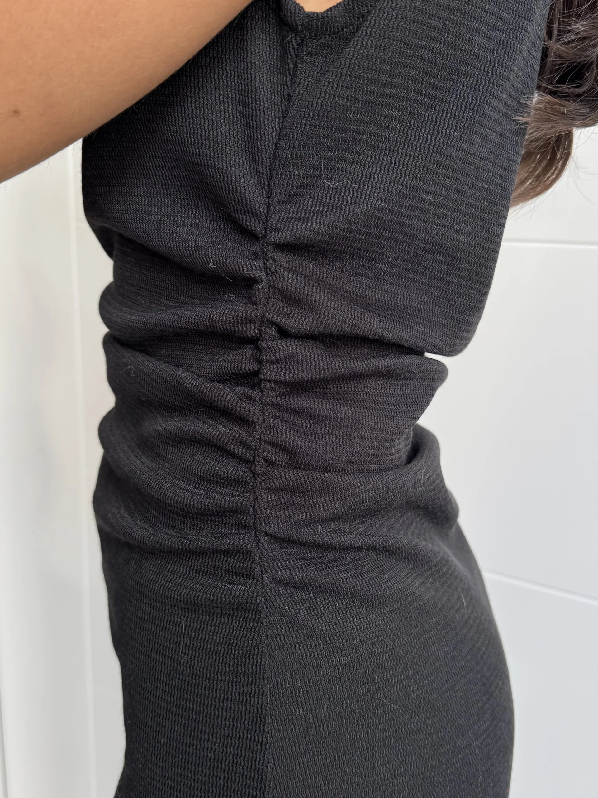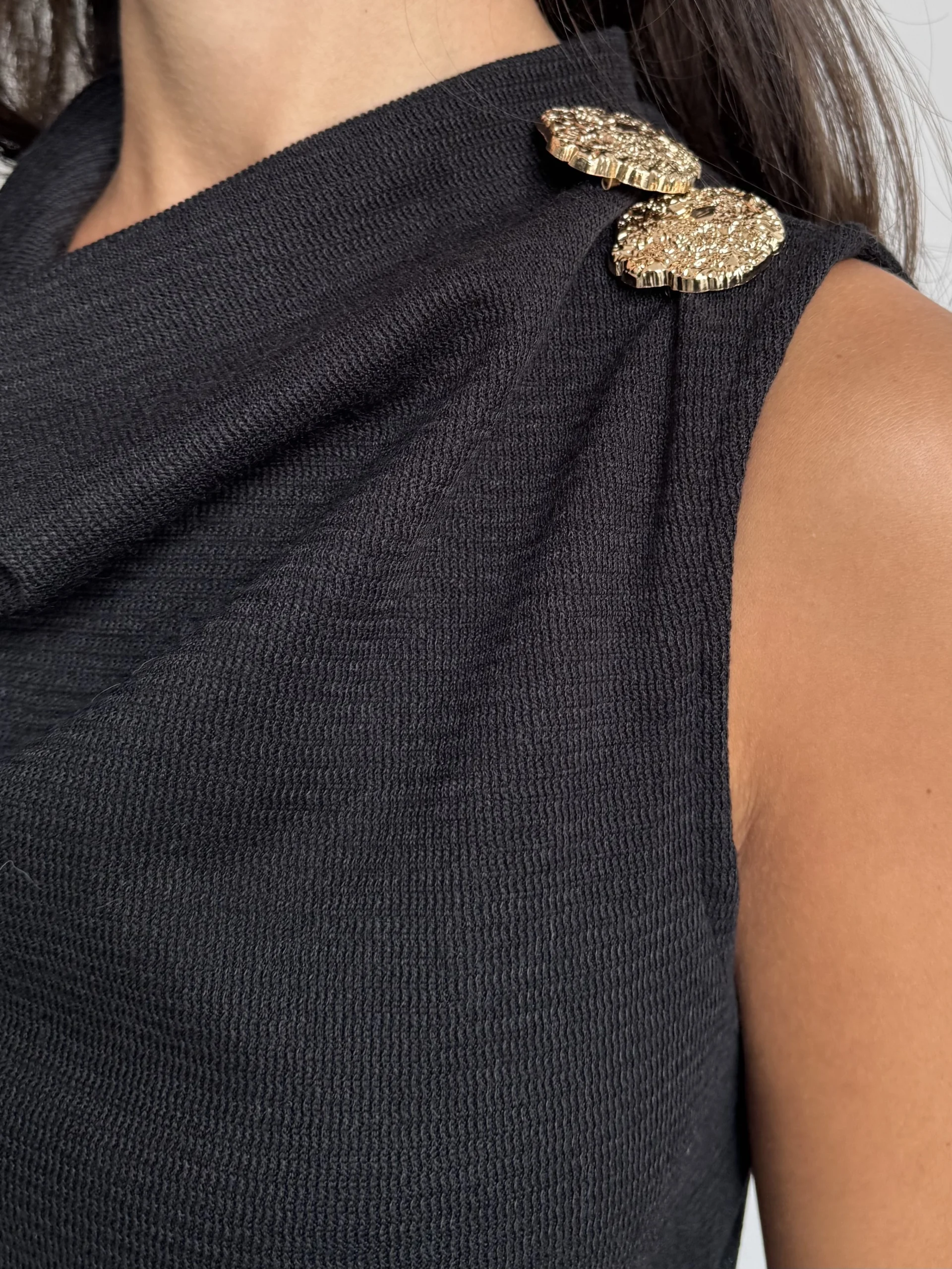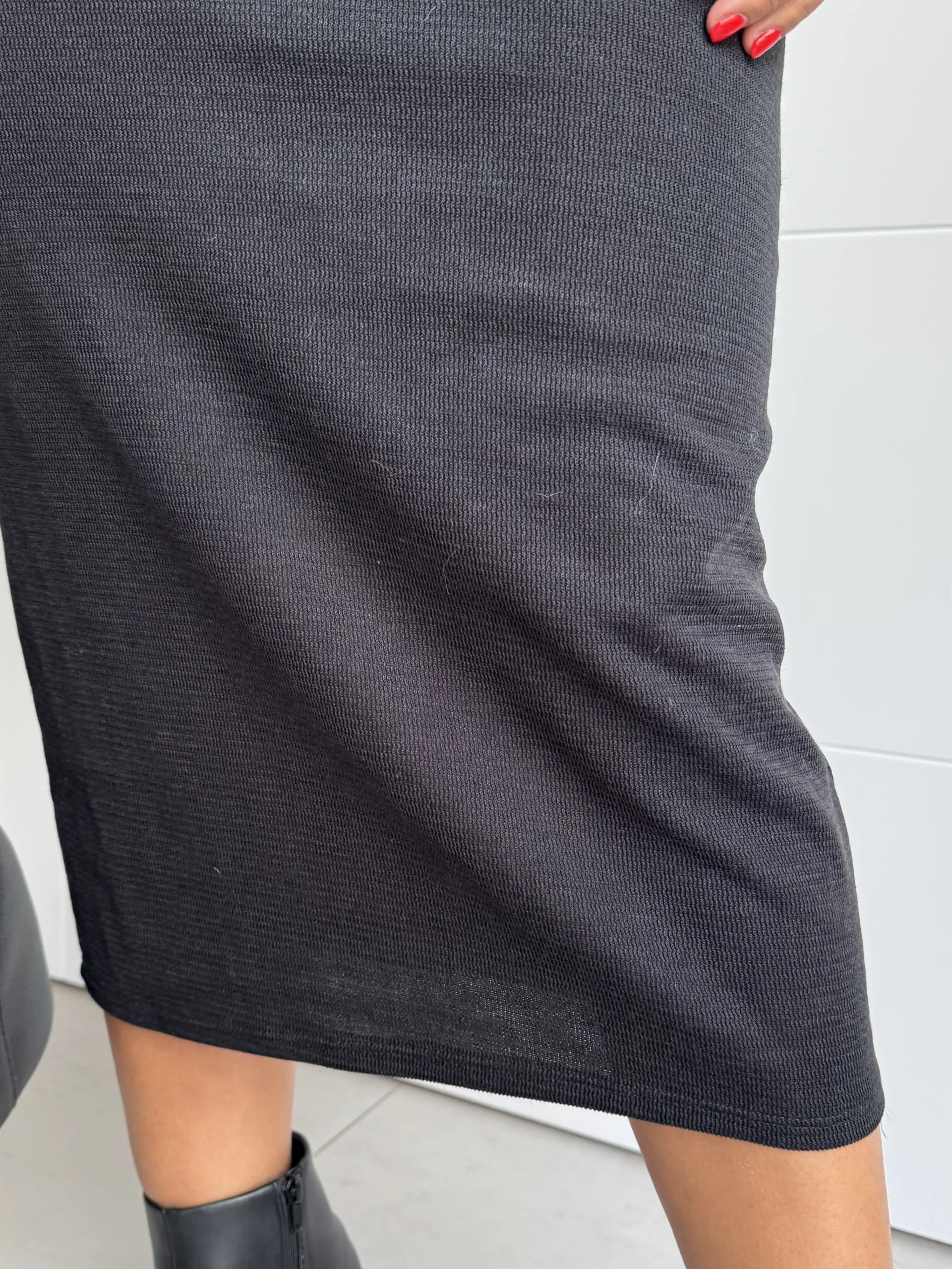 El Vestido Midi Negro cuello drapeado combina elegancia y confort en una prenda imprescindible para ocasiones especiales.