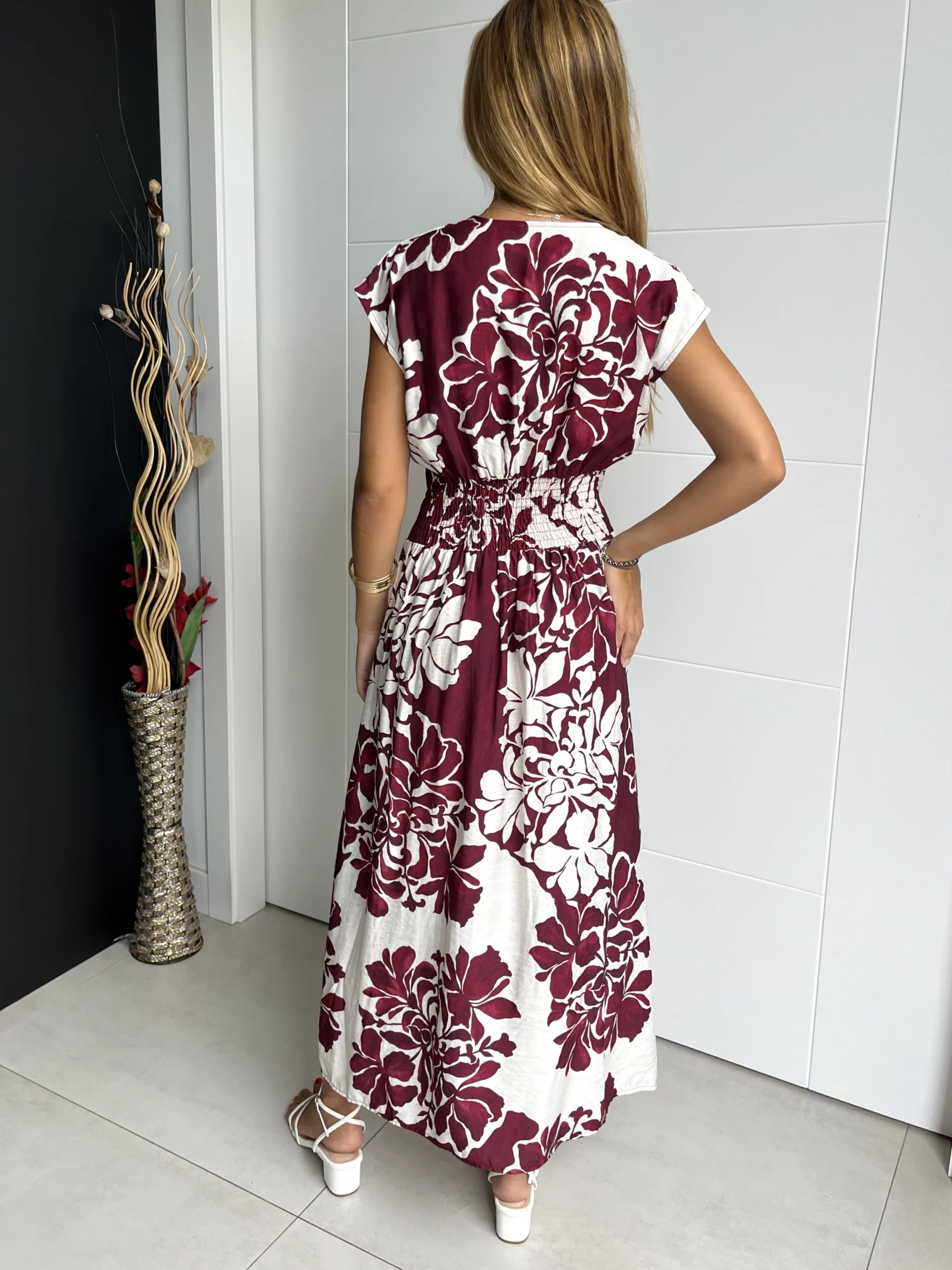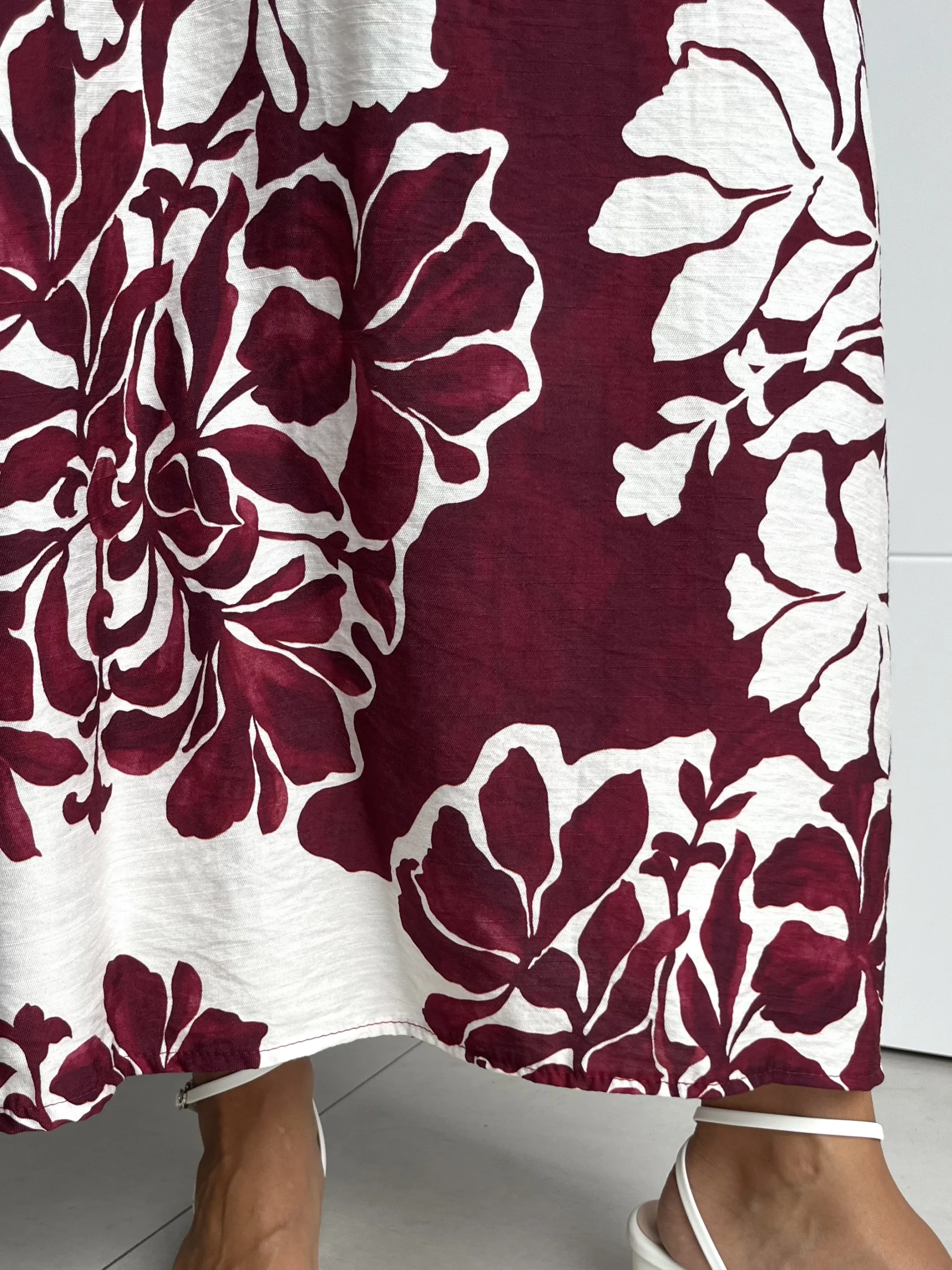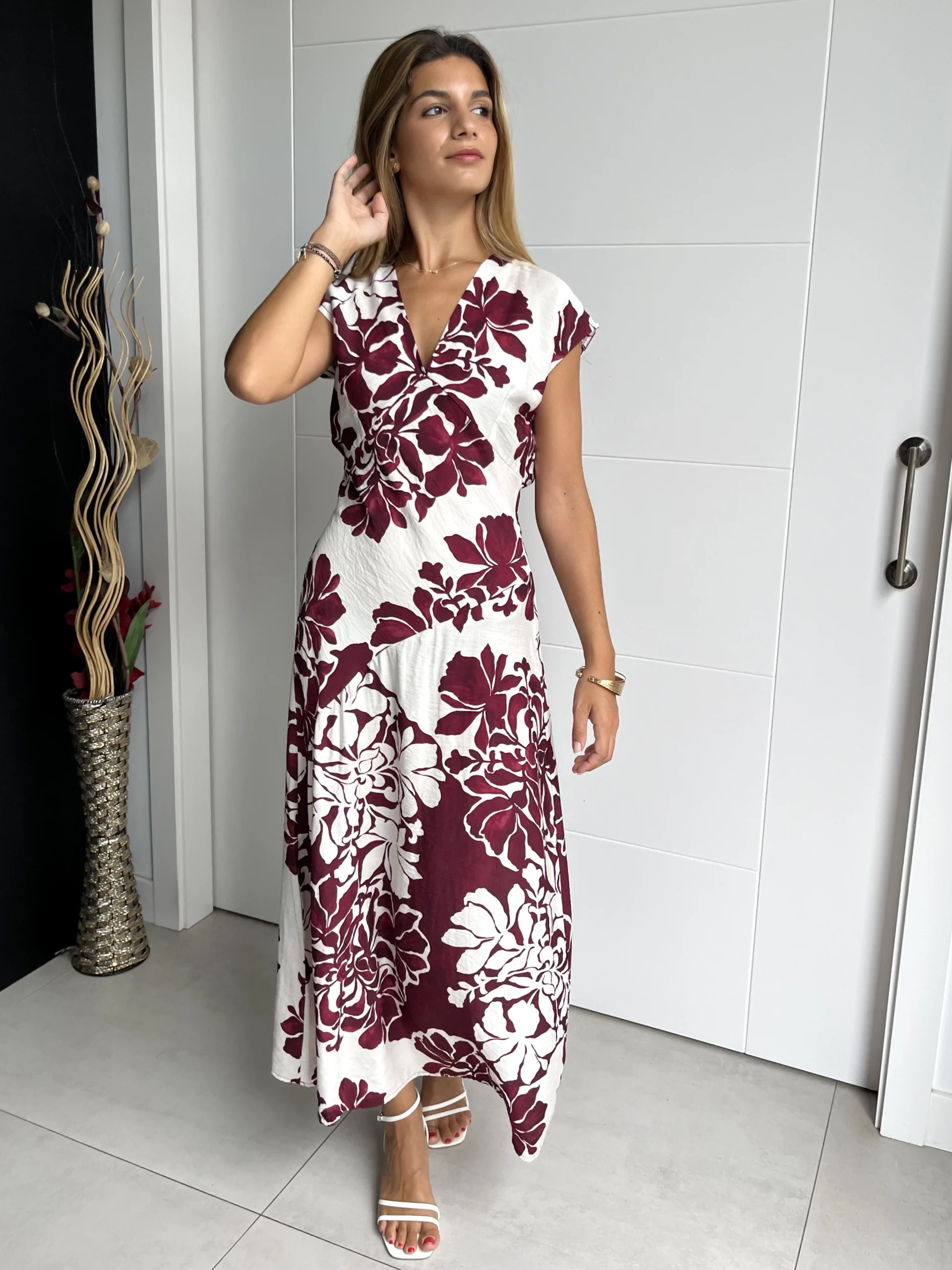 Vestido midi con fondo blanco y estampado de flores burdeos, con escote en pico y manga corta. Espalda drapeada elástica y acabado acampanado. No tiene forro interior. Vestido ligero.