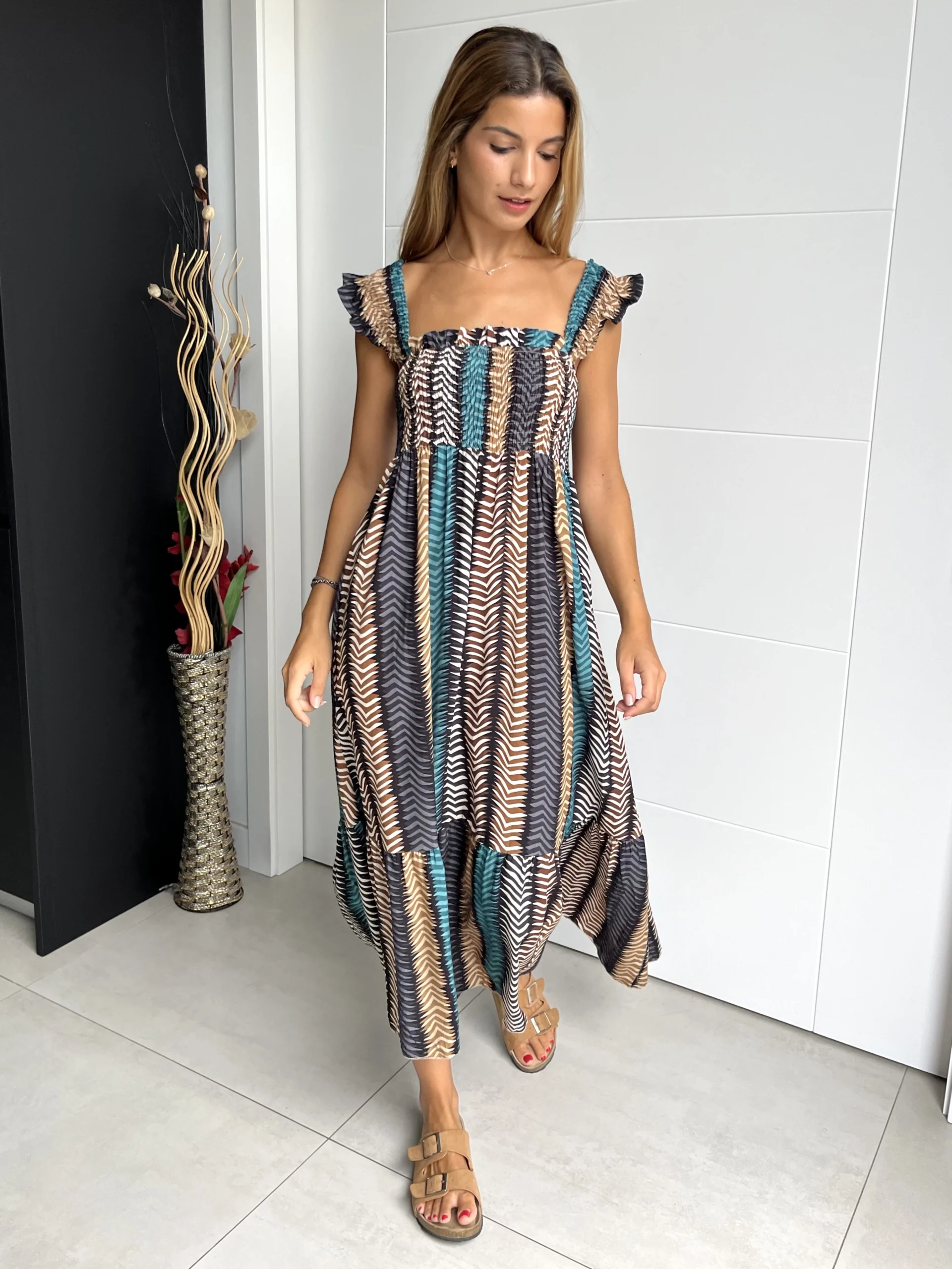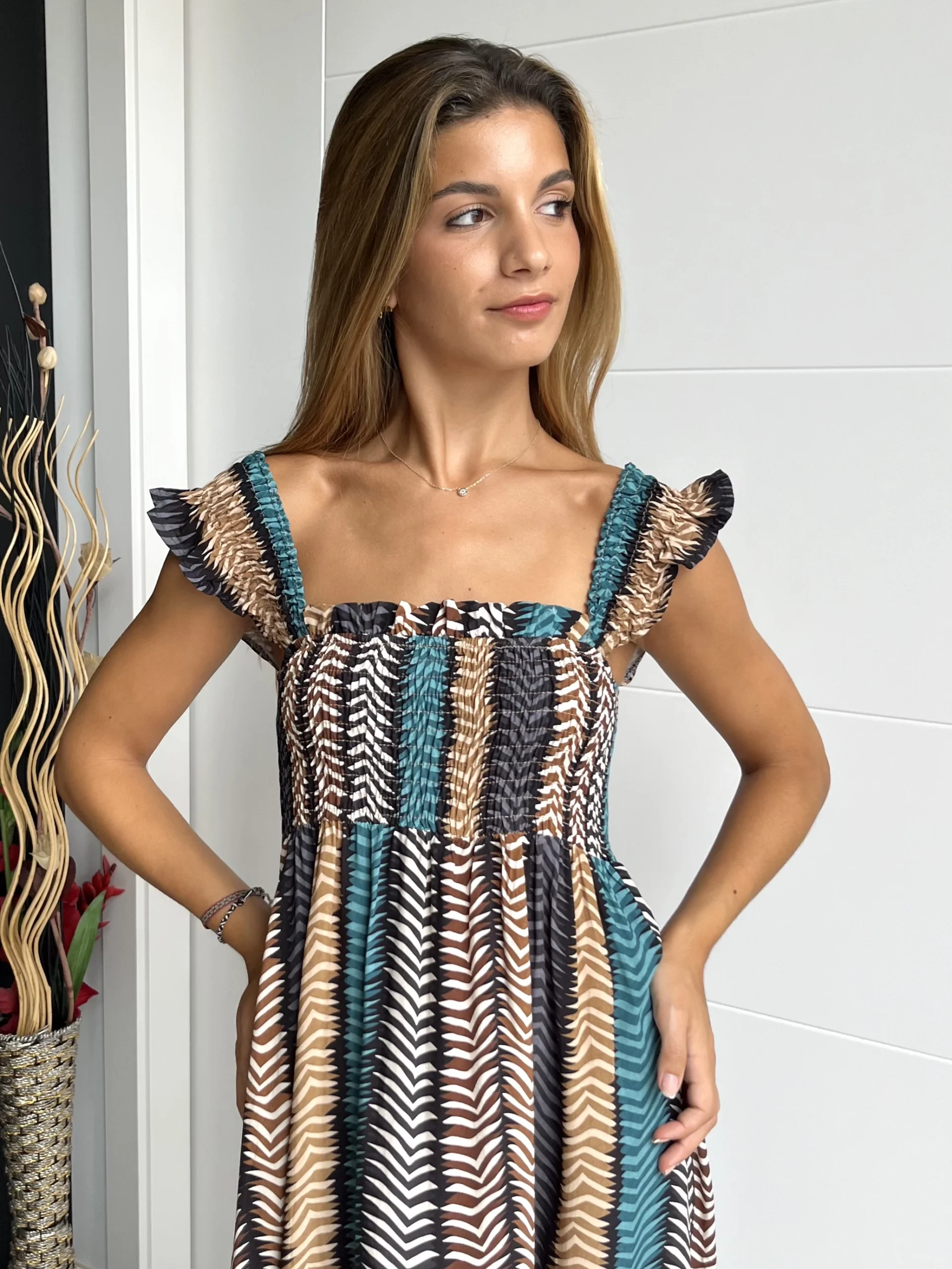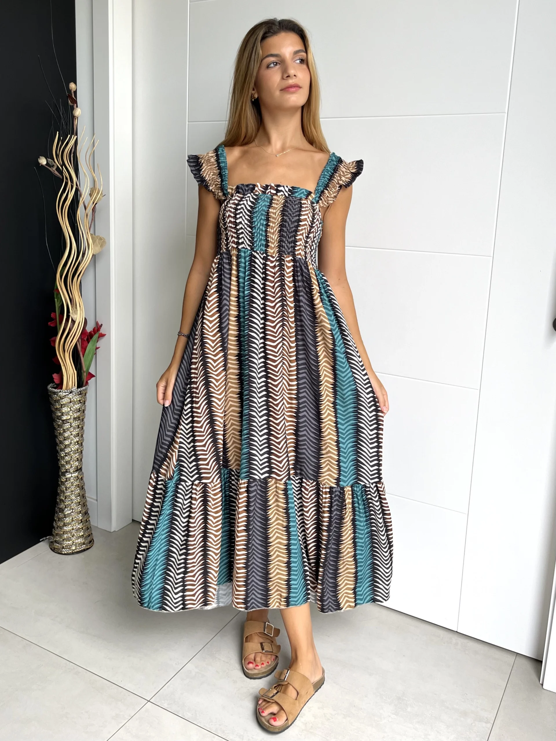 Vestido midi estampado en colores gris, azul, marrón, negro y blanco. Tirantes con volantes, pecho drapeado y falda con volante. Vestido ligero y con vuelo. No tiene forro interior.