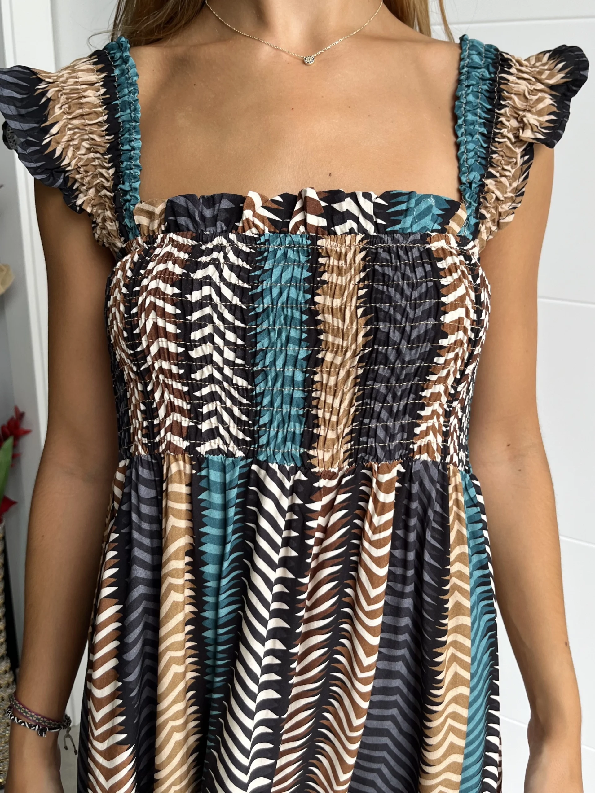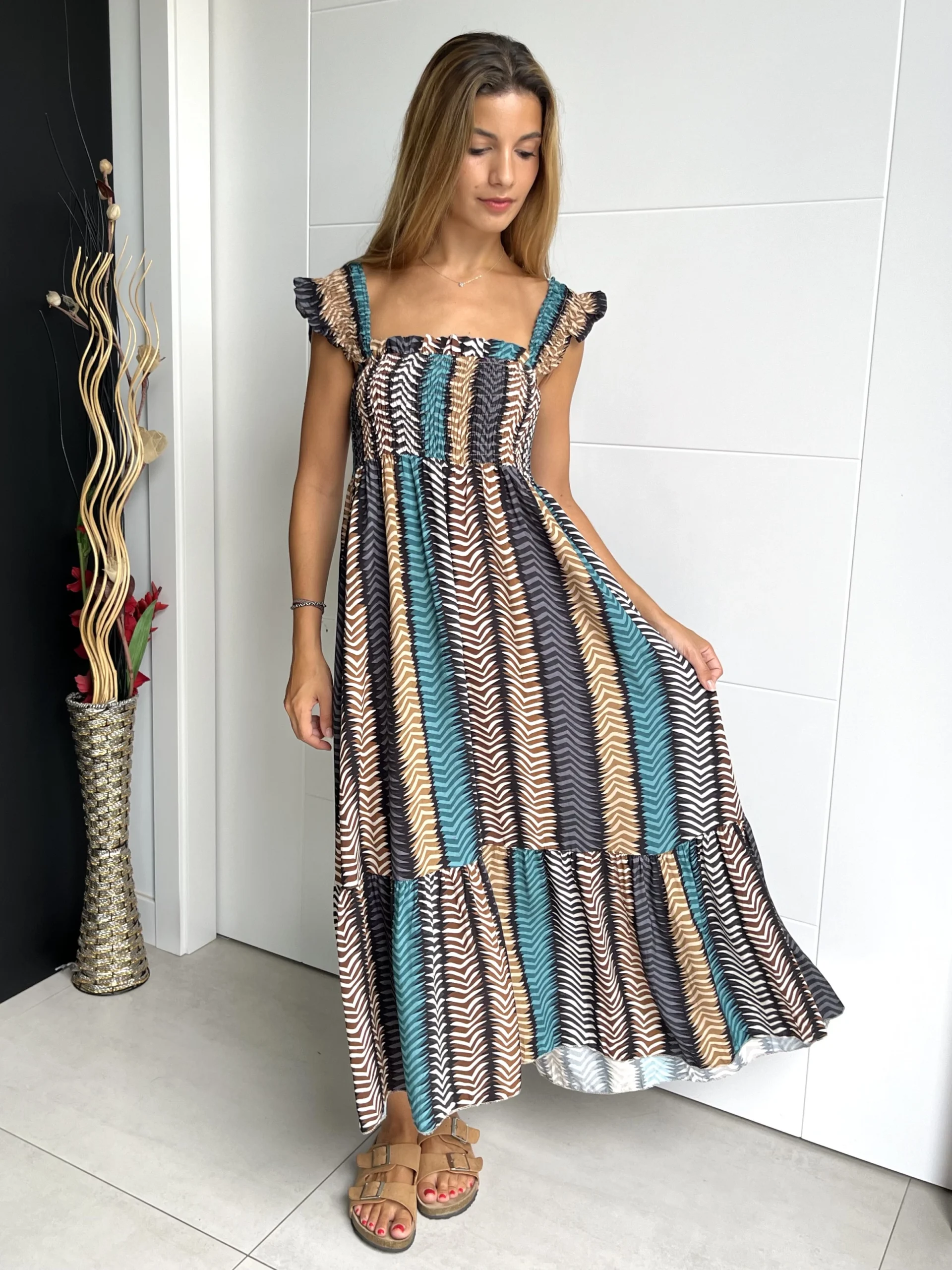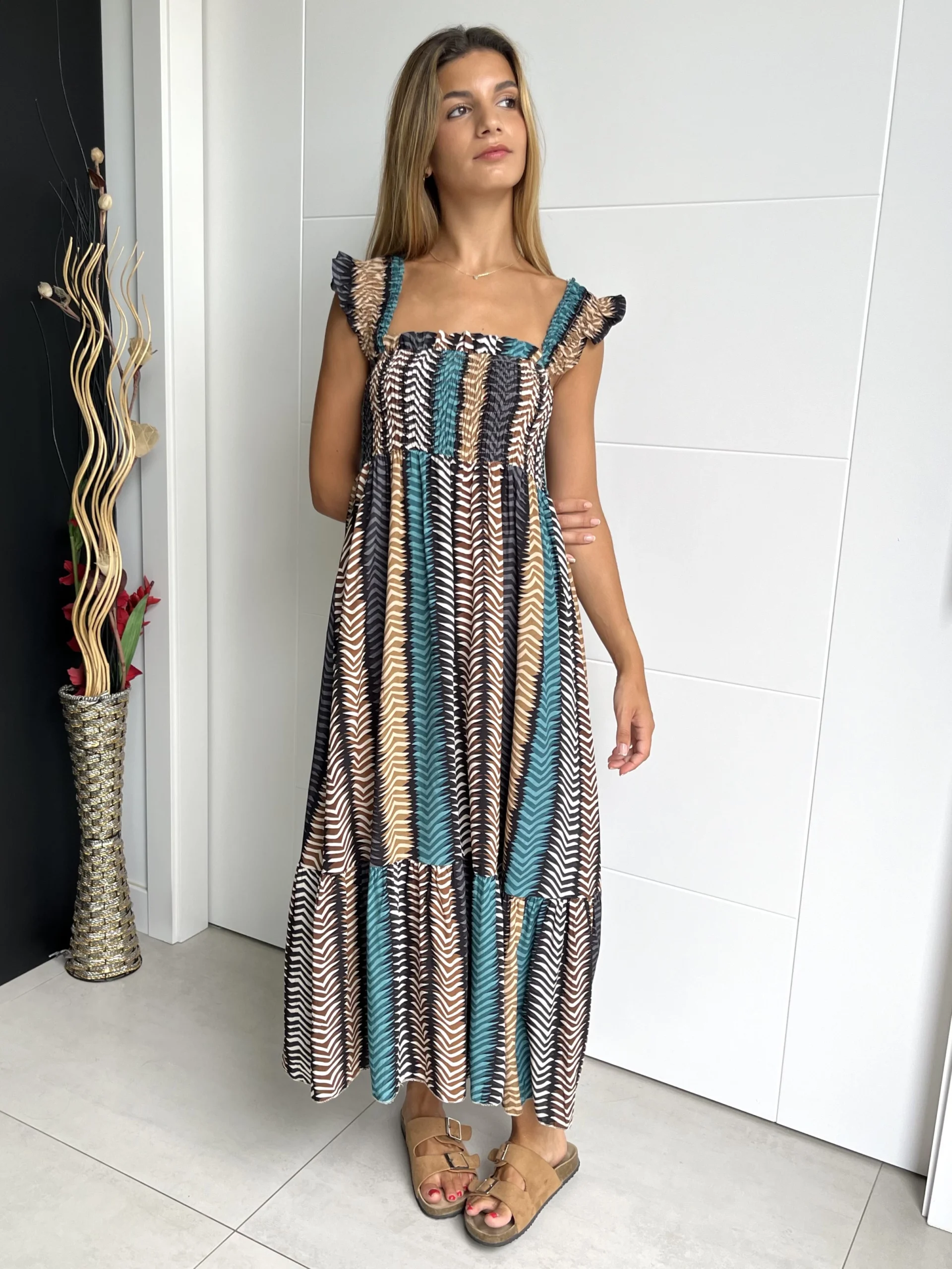 Vestido midi estampado en colores gris, azul, marrón, negro y blanco. Tirantes con volantes, pecho drapeado y falda con volante. Vestido ligero y con vuelo. No tiene forro interior.