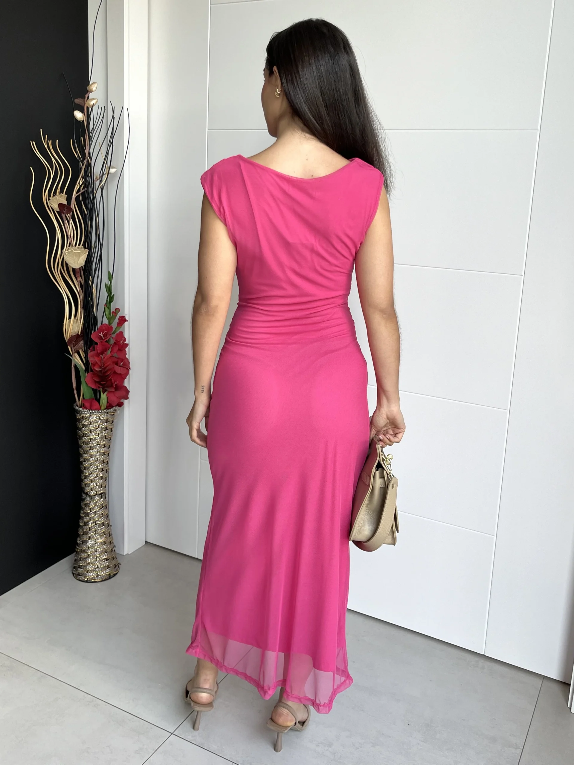 Vestido midi de tul liso en color rosa fucsia. Escote bandeja y cintura drapeada. Forro interior rosa y caída evasé. Elástico y ajustado al cuerpo.