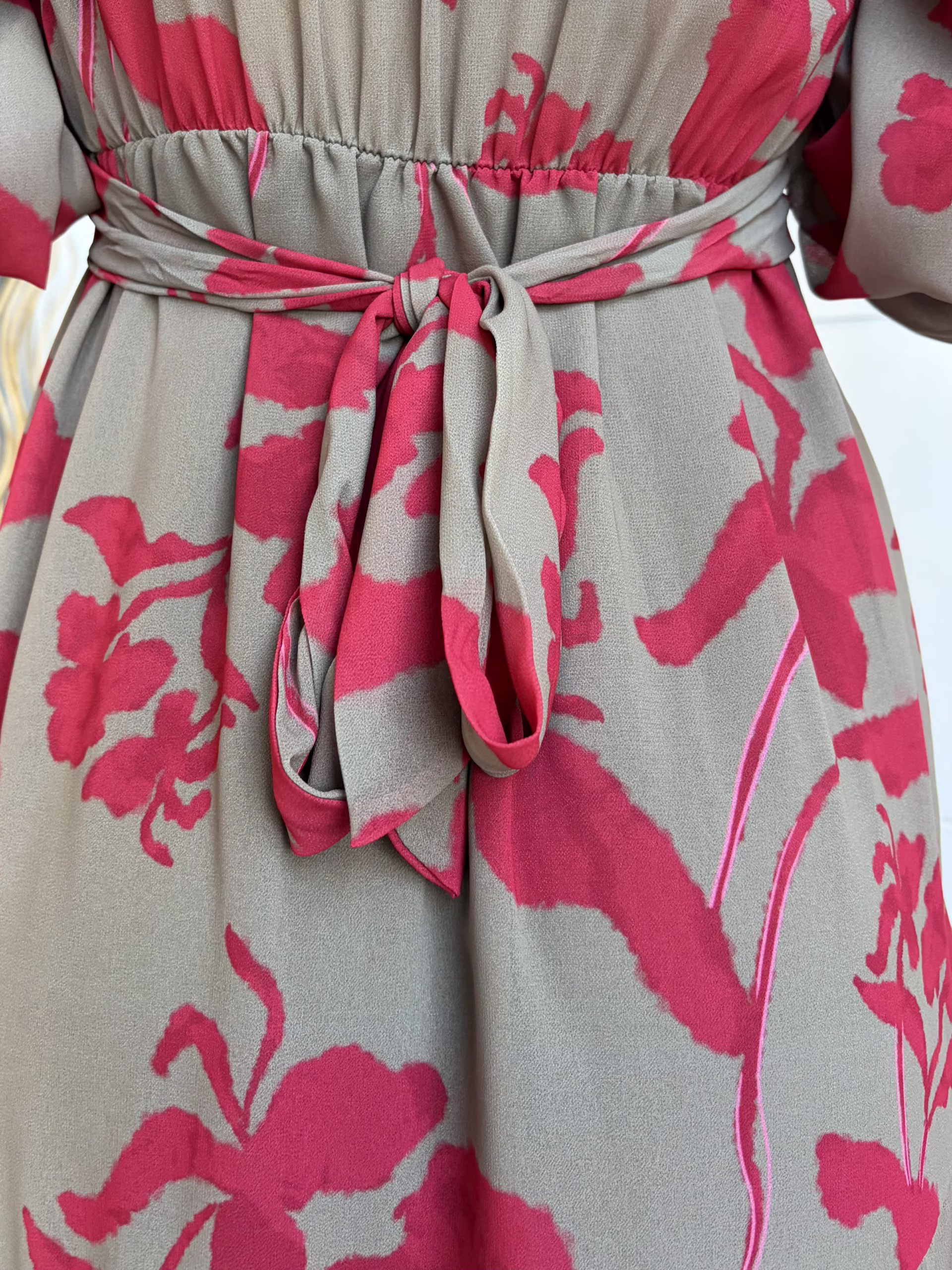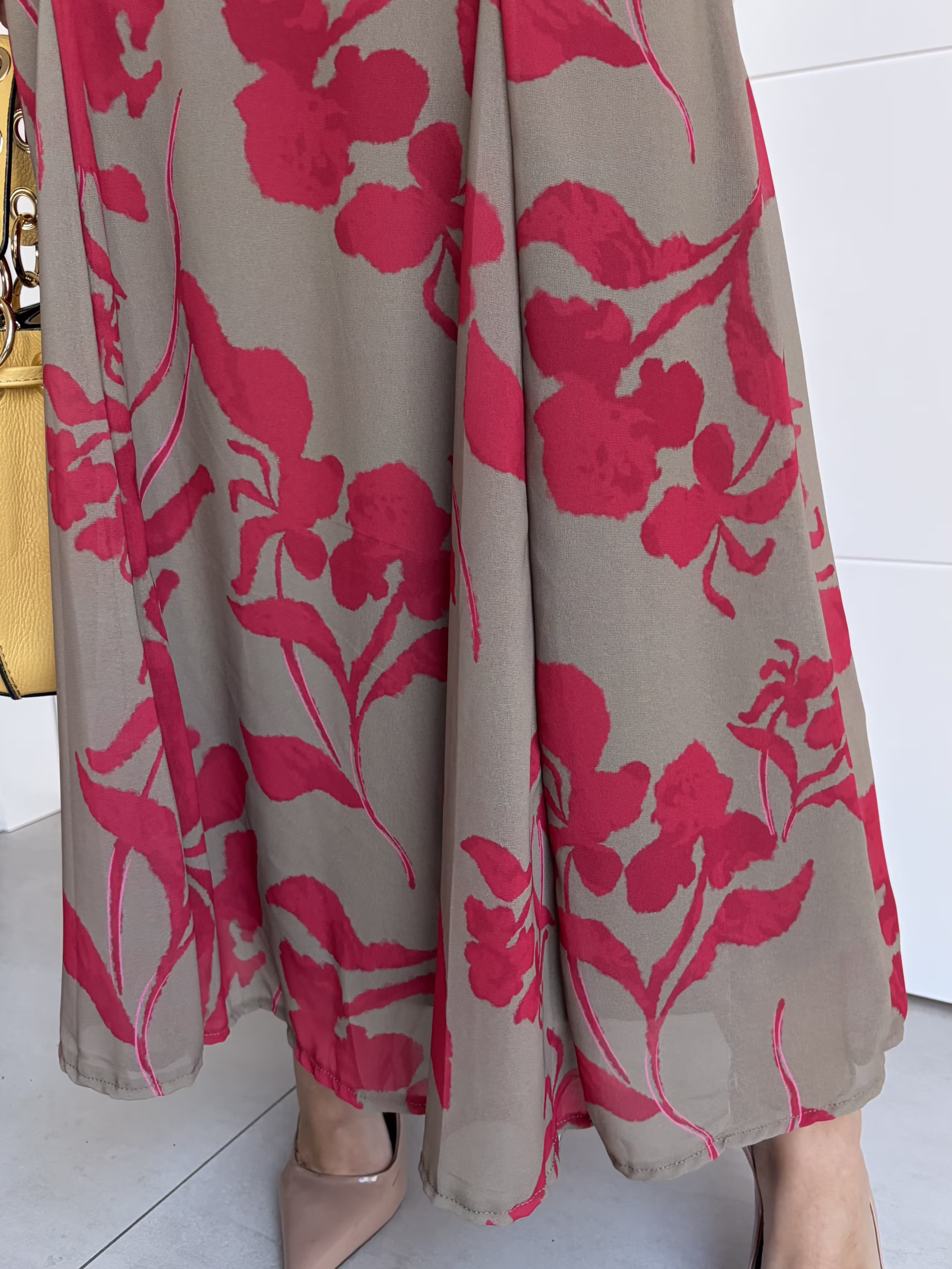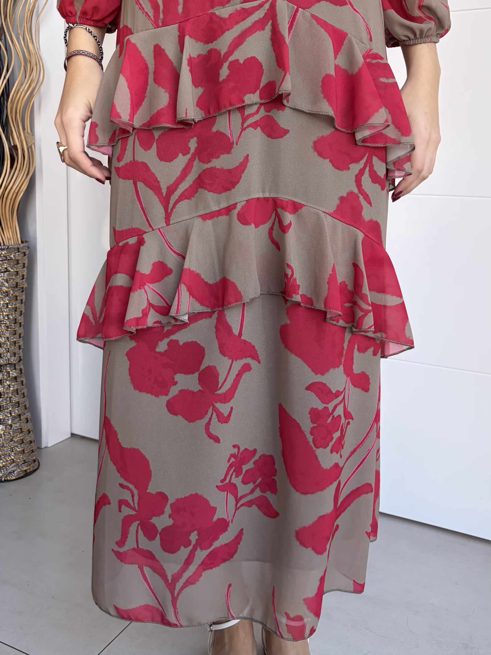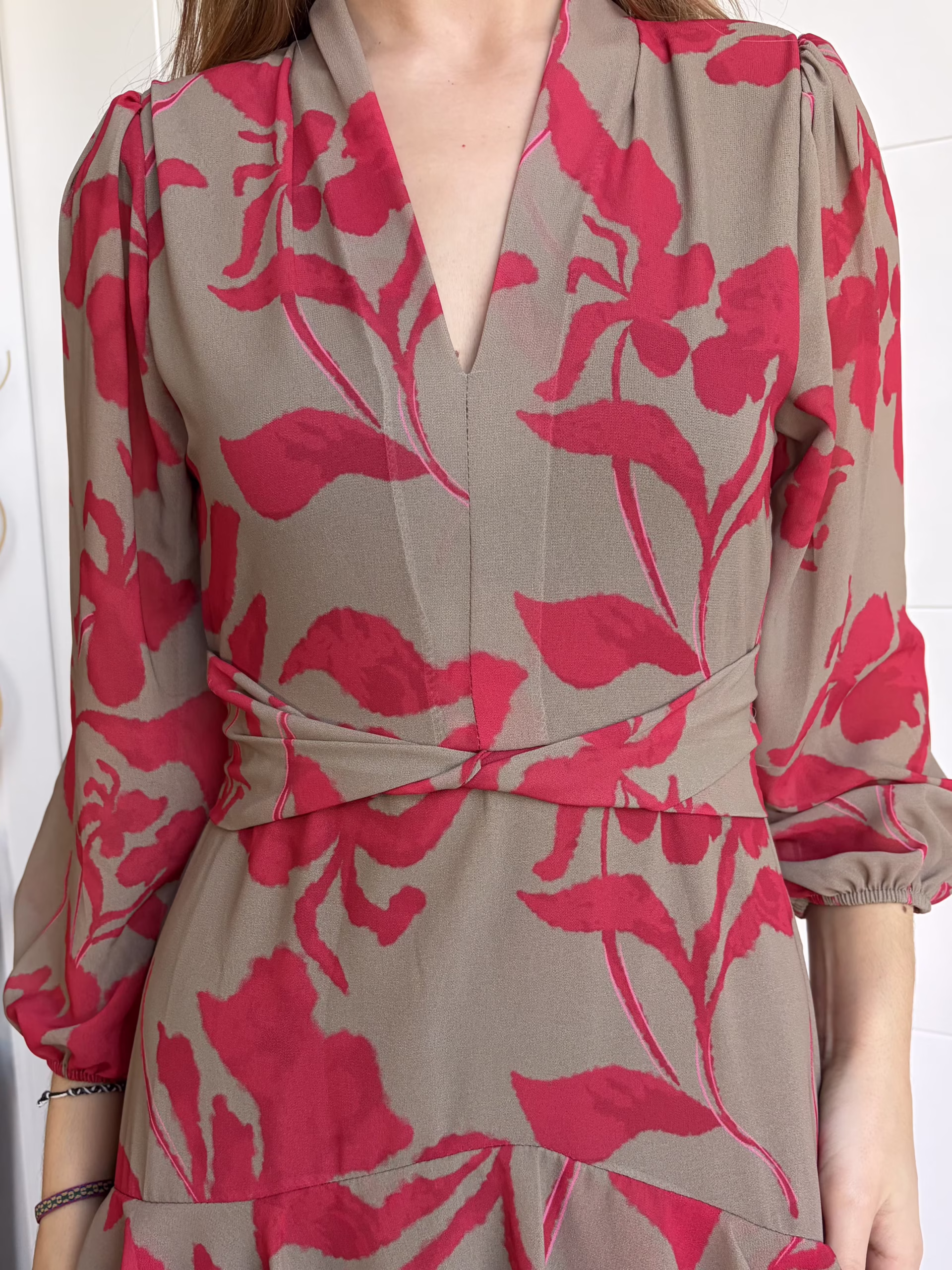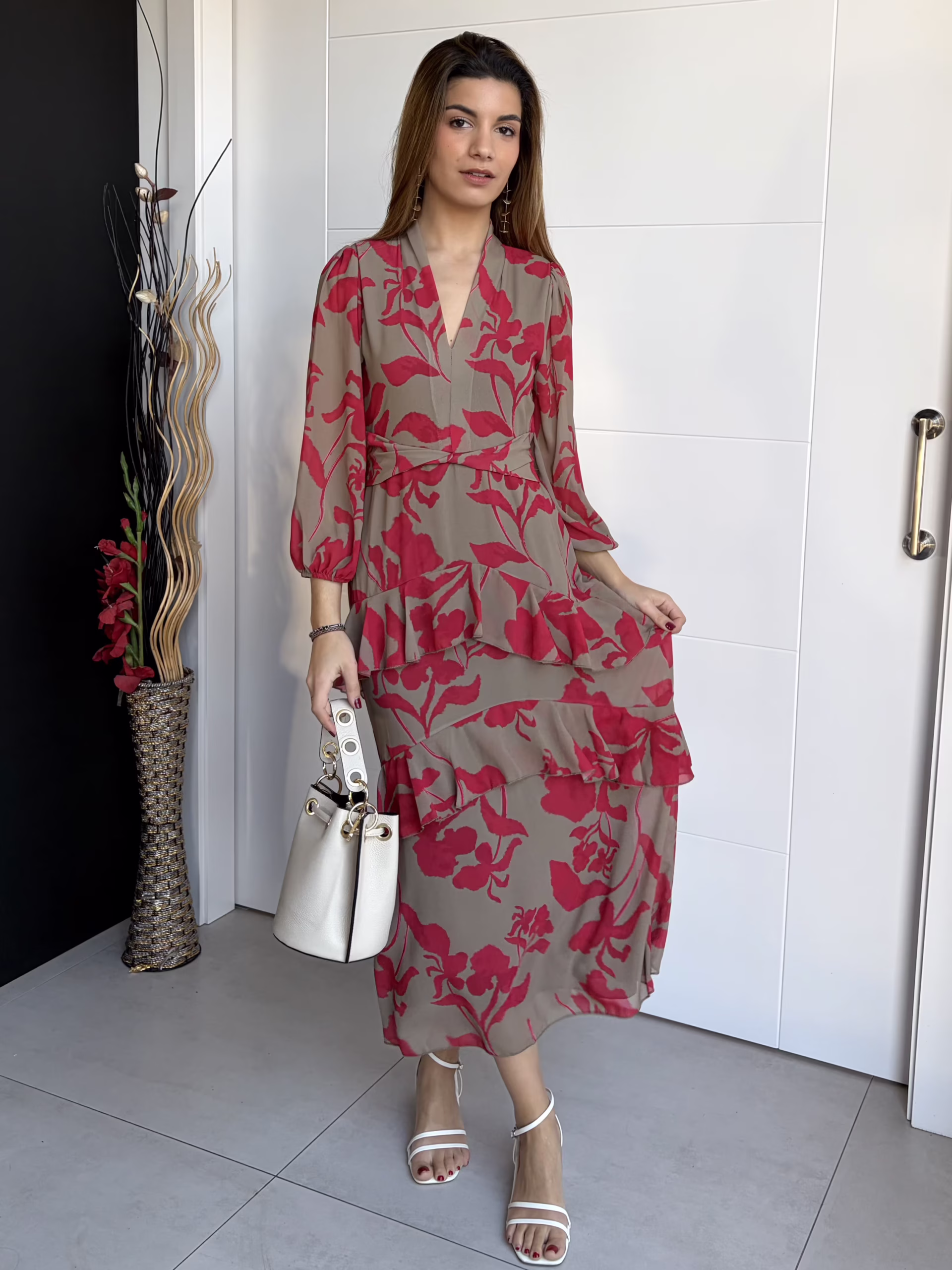 Vestido midi de gasa con estampado floral en rojo intenso sobre base nude. Diseño cruzado con escote en V que estiliza el escote y alarga visualmente la silueta. Cintura marcada con efecto fajín que realza la figura. Espalda con lazada ajustable. Falda con volantes asimétricos que aportan movimiento y ligereza al caminar. Manga francesa fluida con puño elástico. Forro interior a tono.