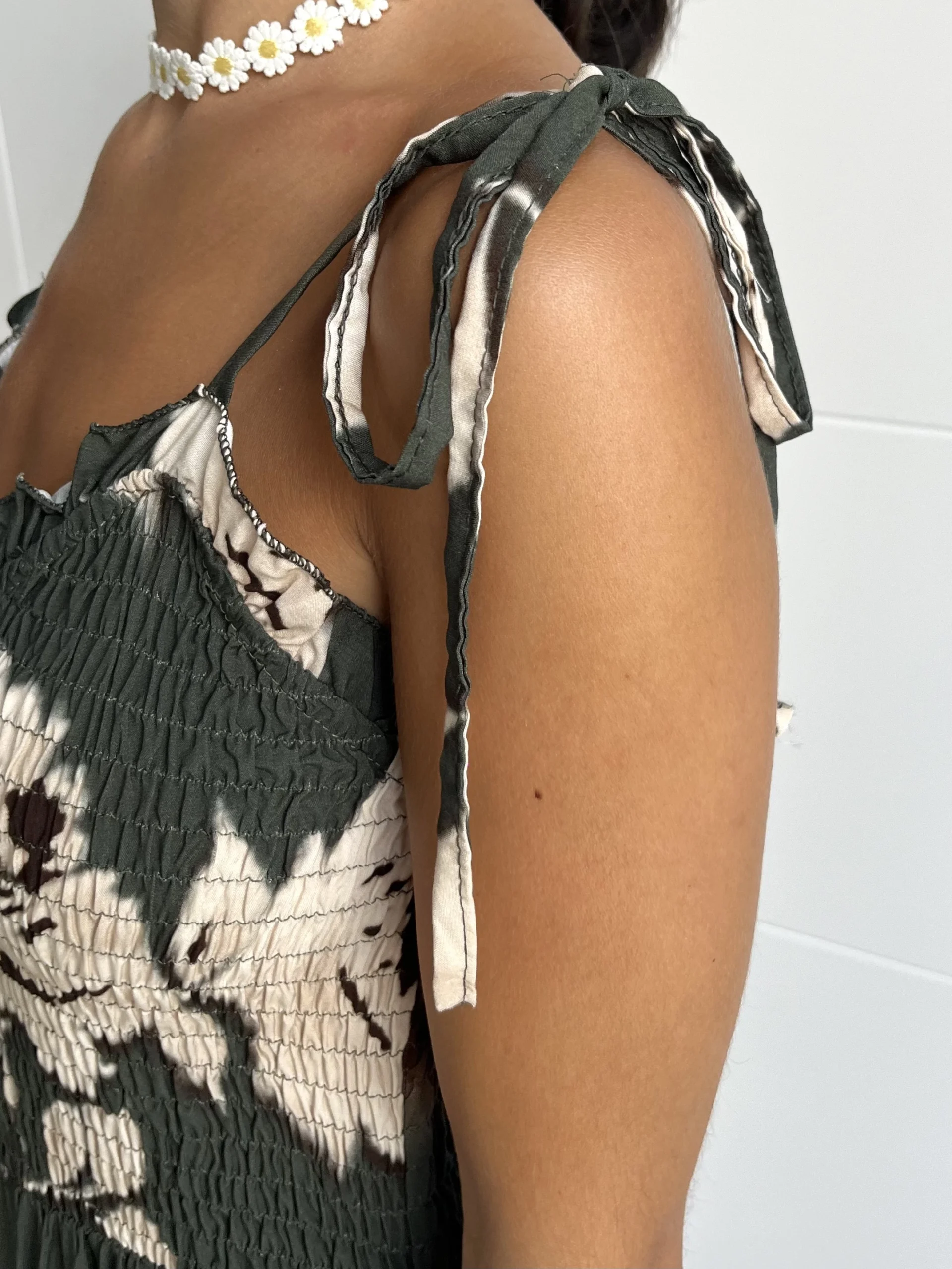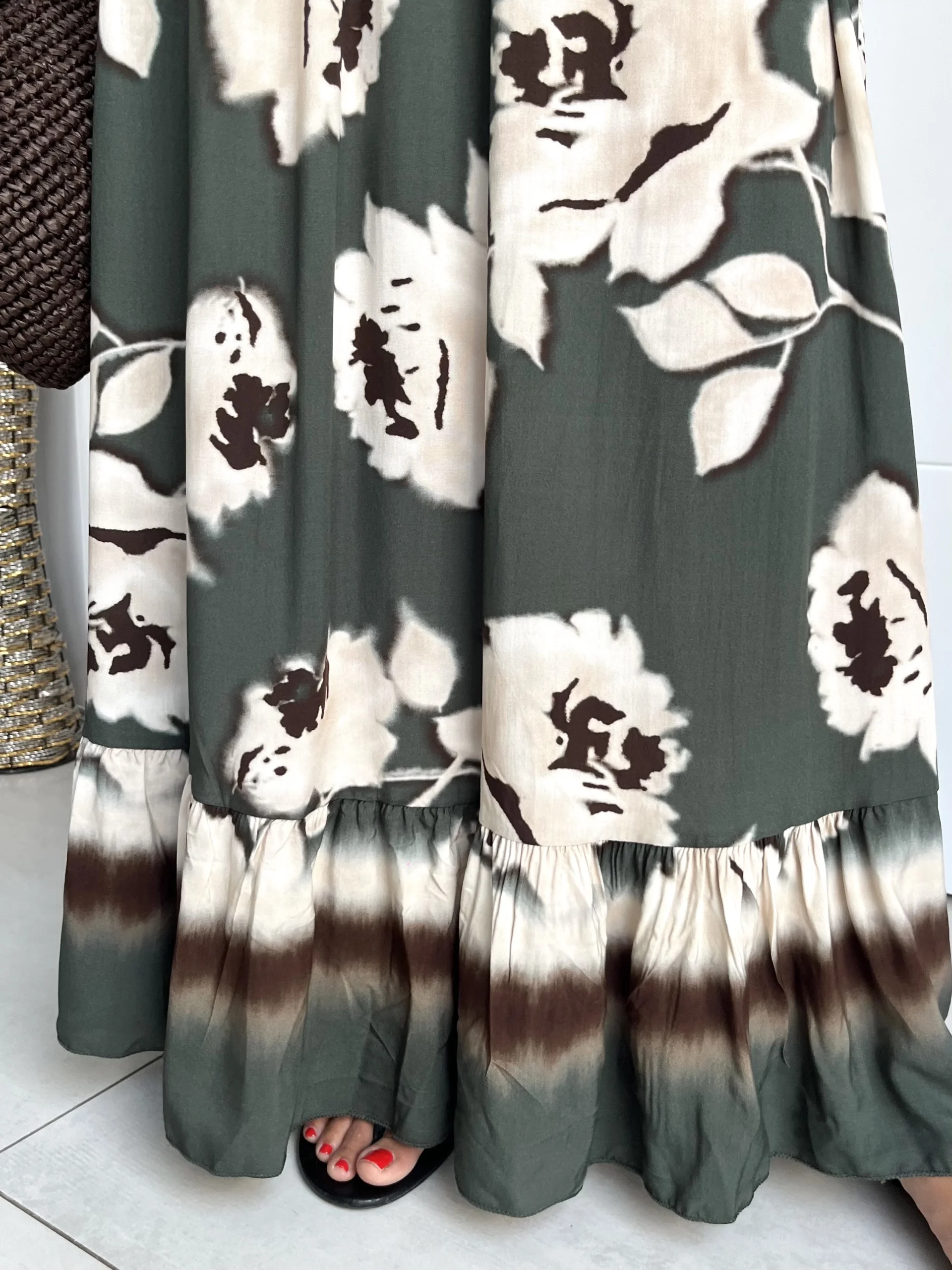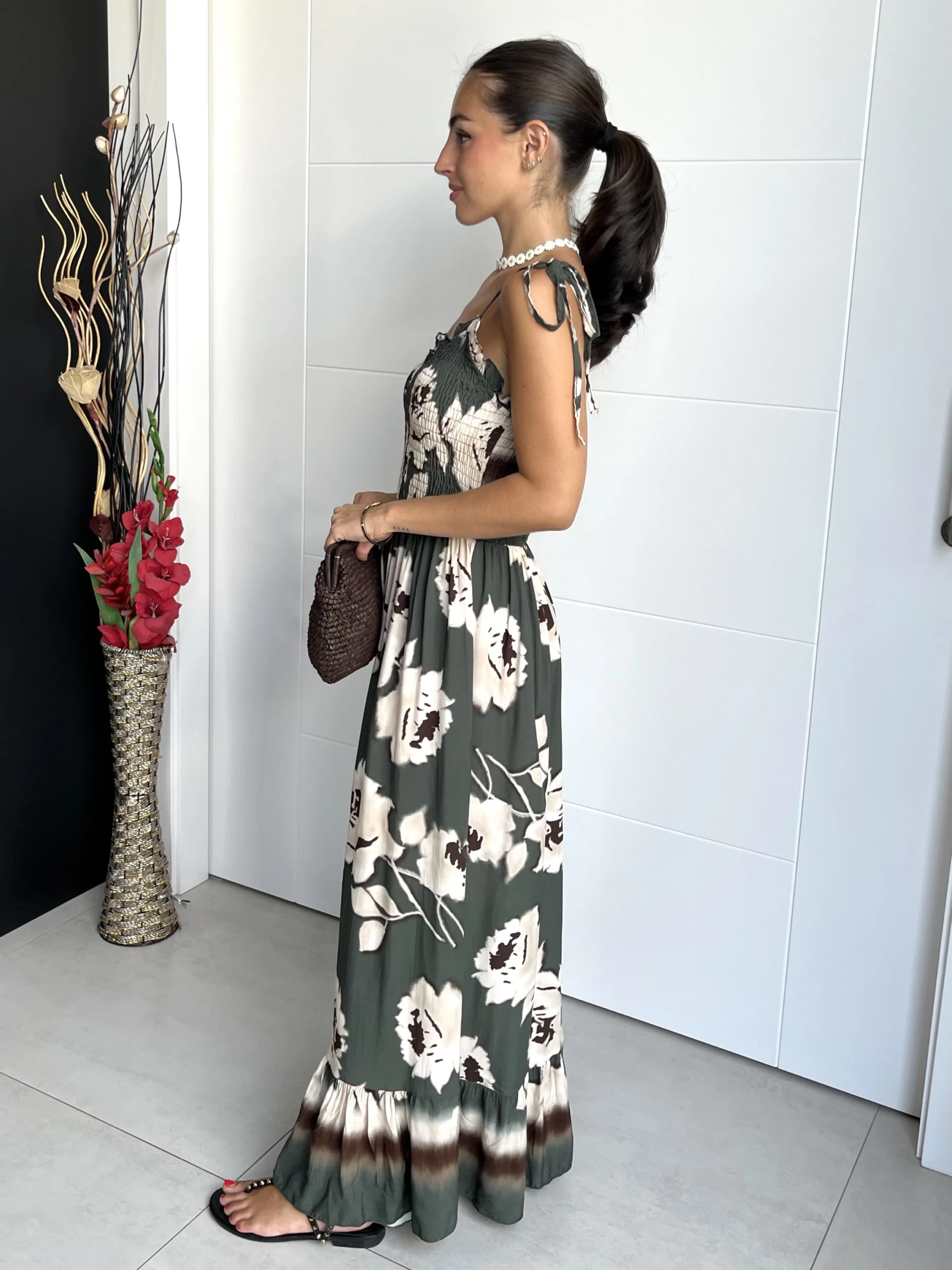 Vestido playero de tirantes ajustables, con la zona del pecho y espalda drapeados. Vestido de color verde oliva con estampado difuminado en colores crudo y marrón chocolate. Escote en V con pequeño volante. Caída evasé, vestido con vuelo y movimiento. No tiene forro interior y falda con volante.