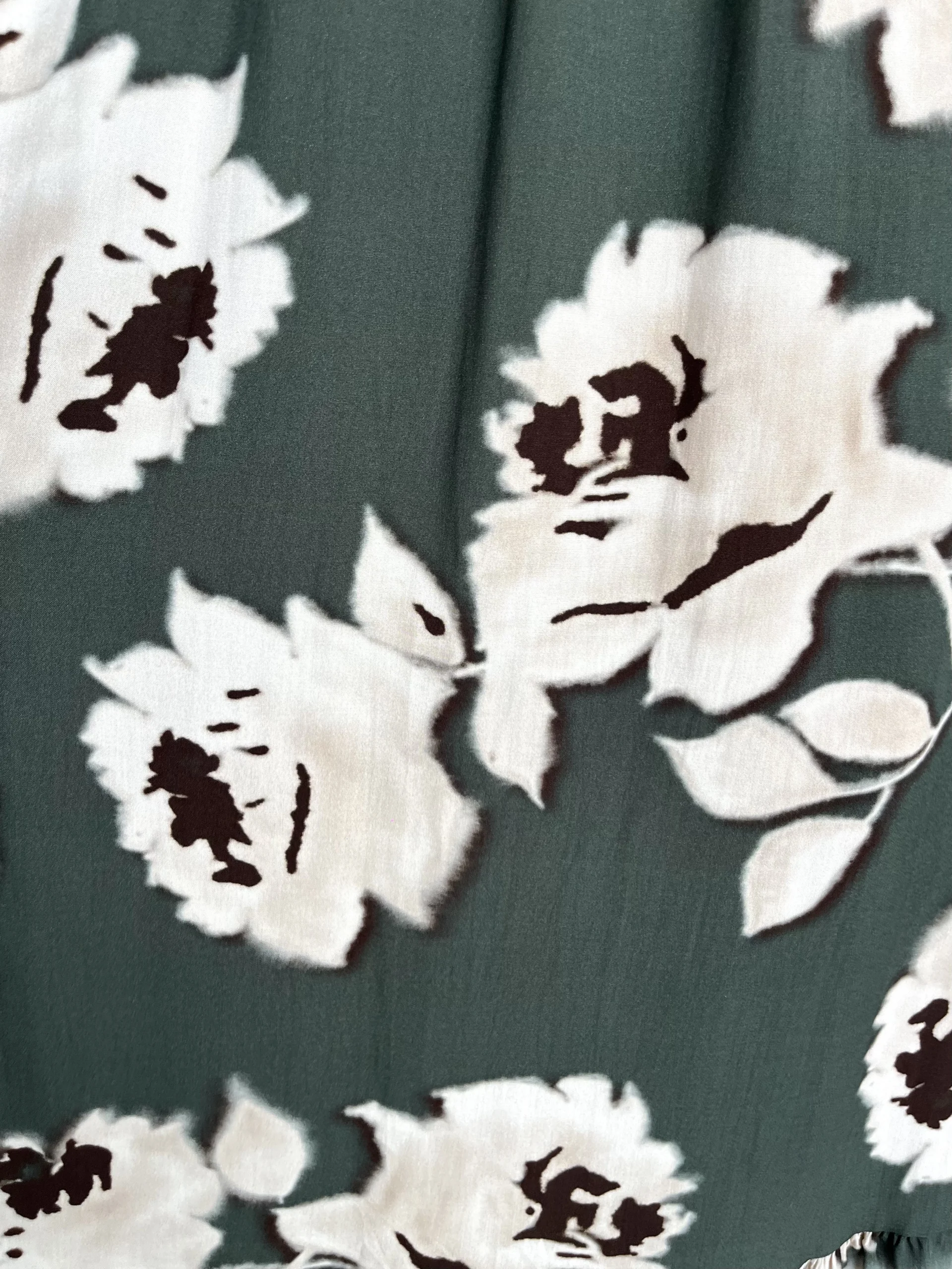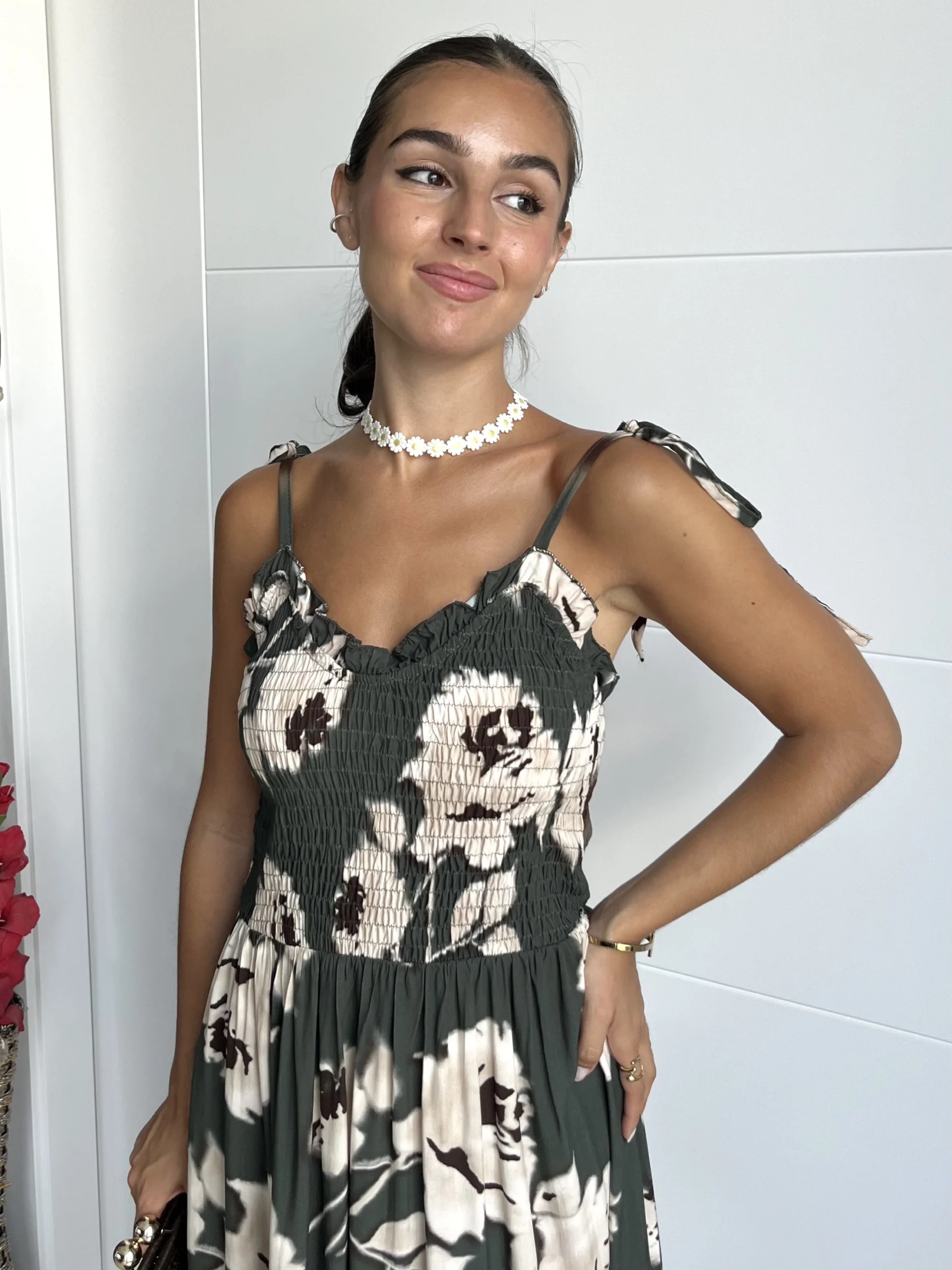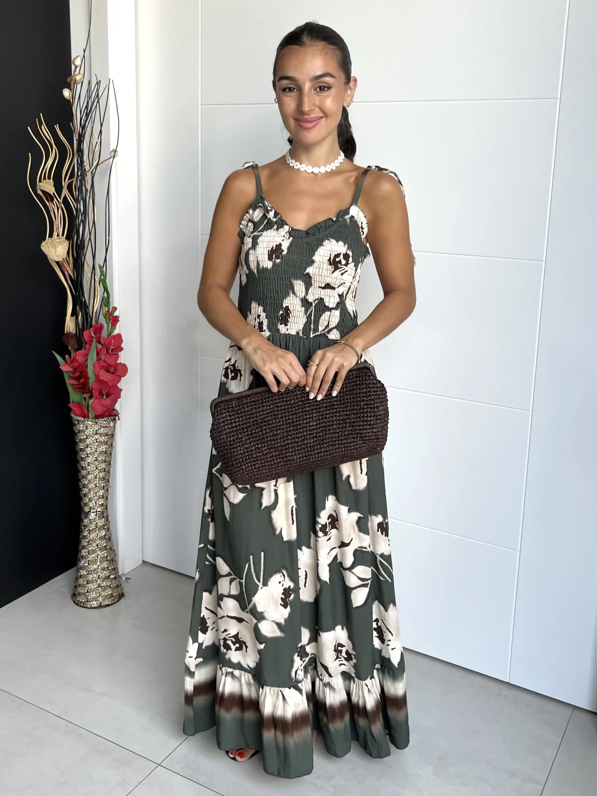 Vestido playero de tirantes ajustables, con la zona del pecho y espalda drapeados. Vestido de color verde oliva con estampado difuminado en colores crudo y marrón chocolate. Escote en V con pequeño volante. Caída evasé, vestido con vuelo y movimiento. No tiene forro interior y falda con volante.