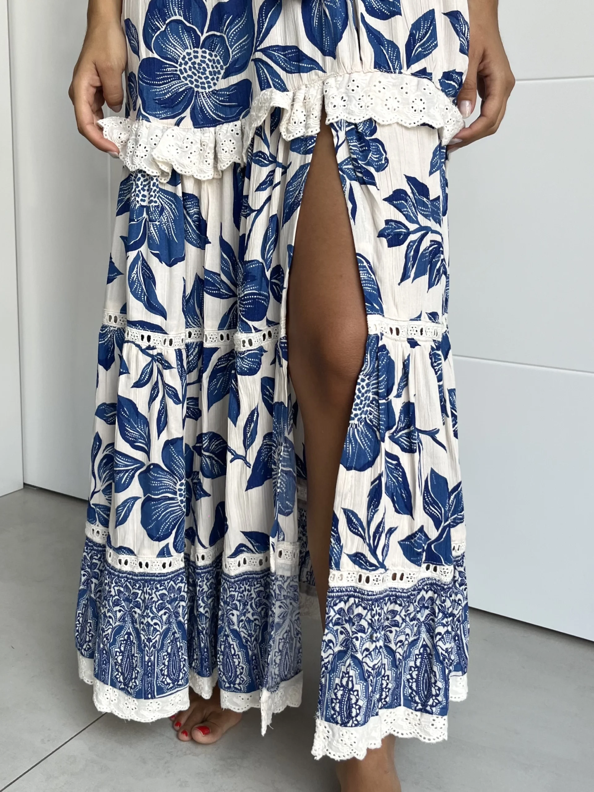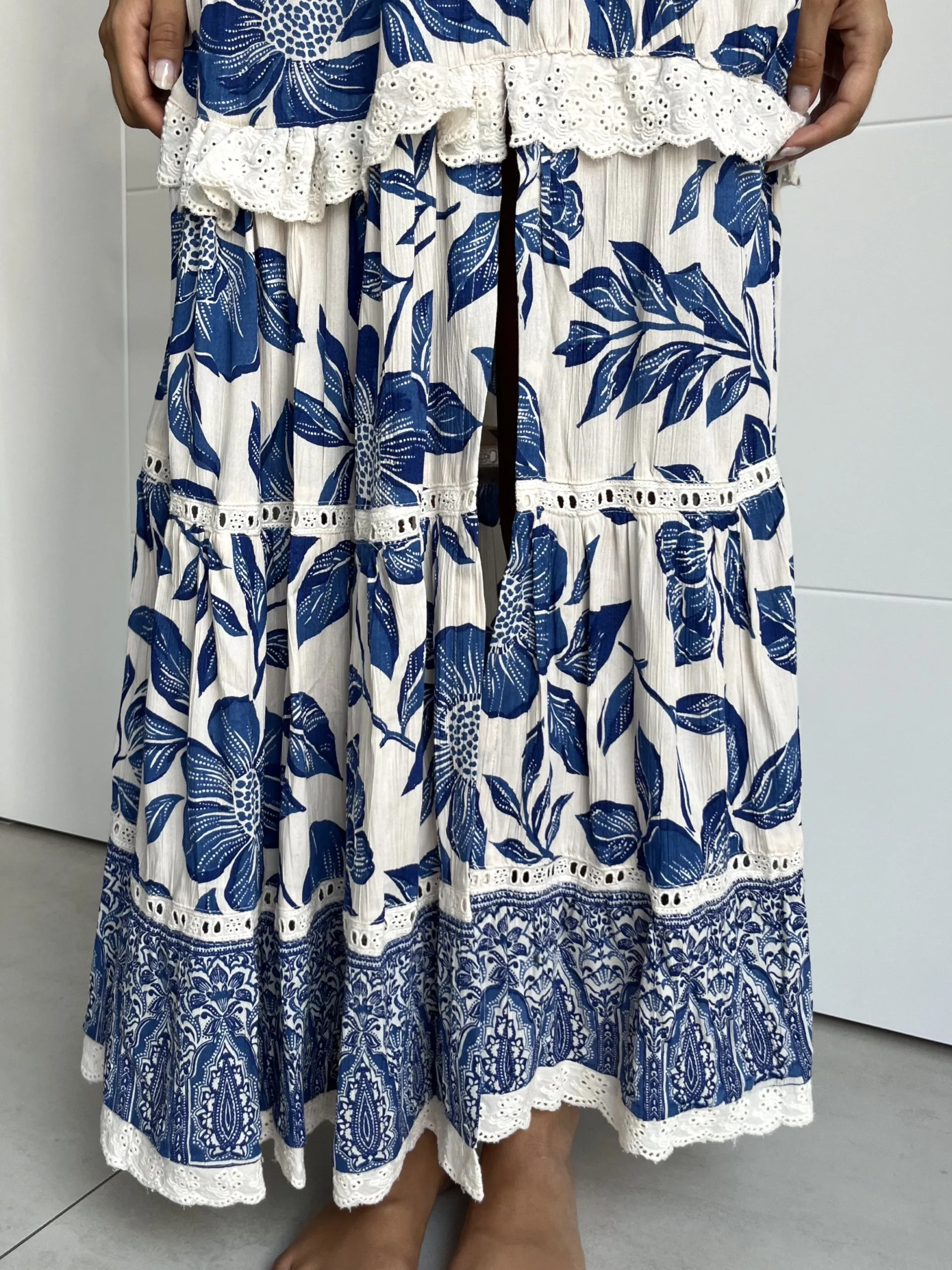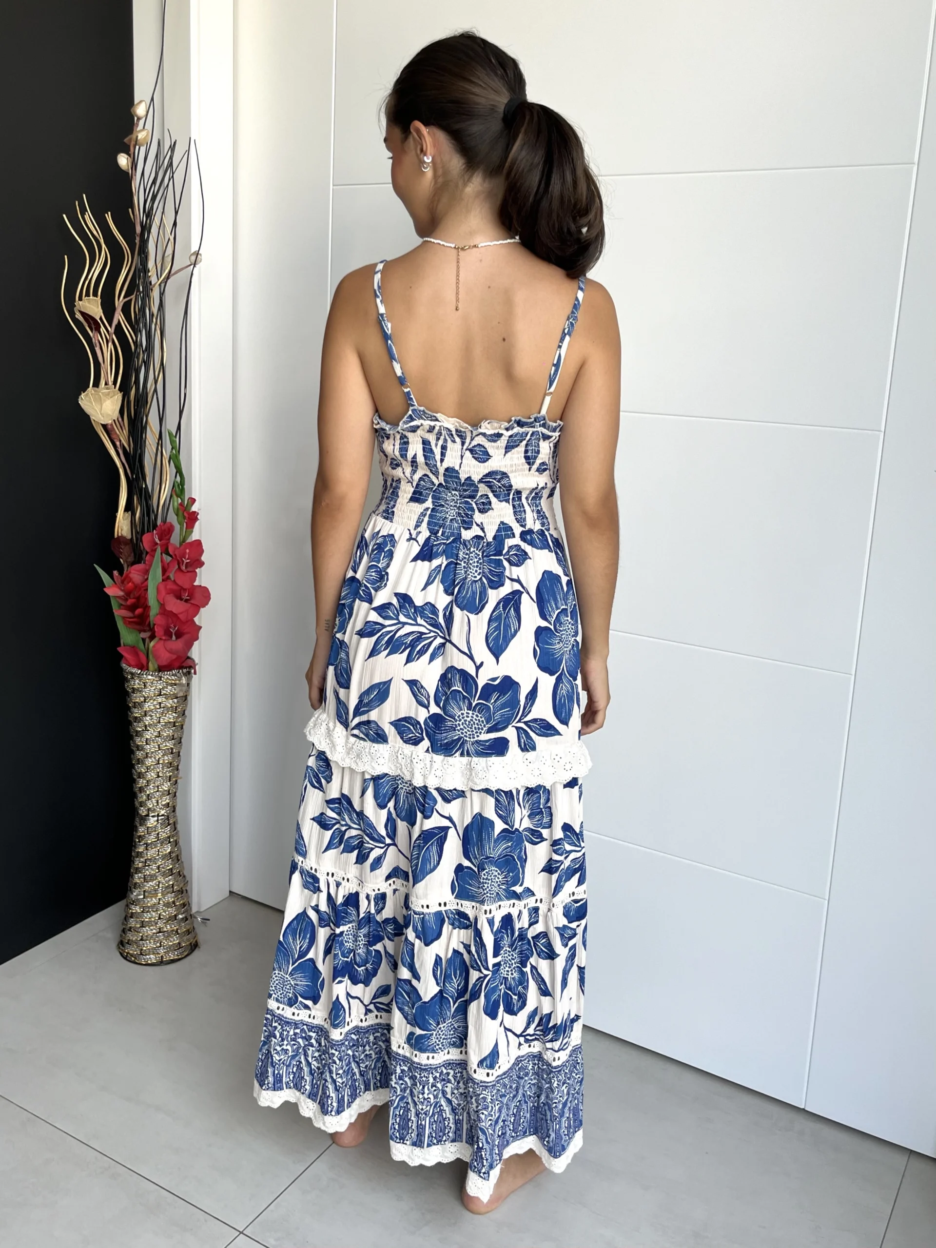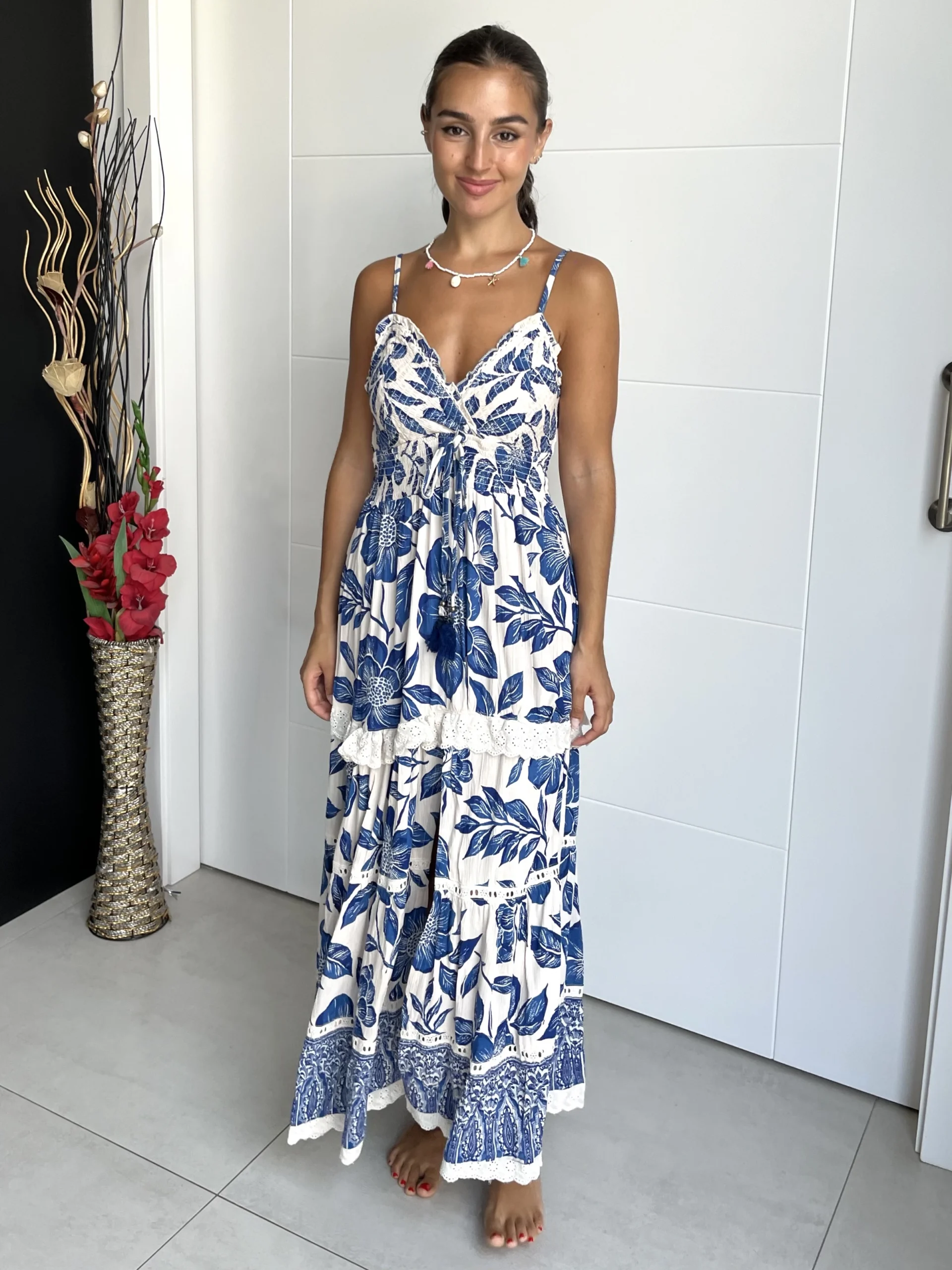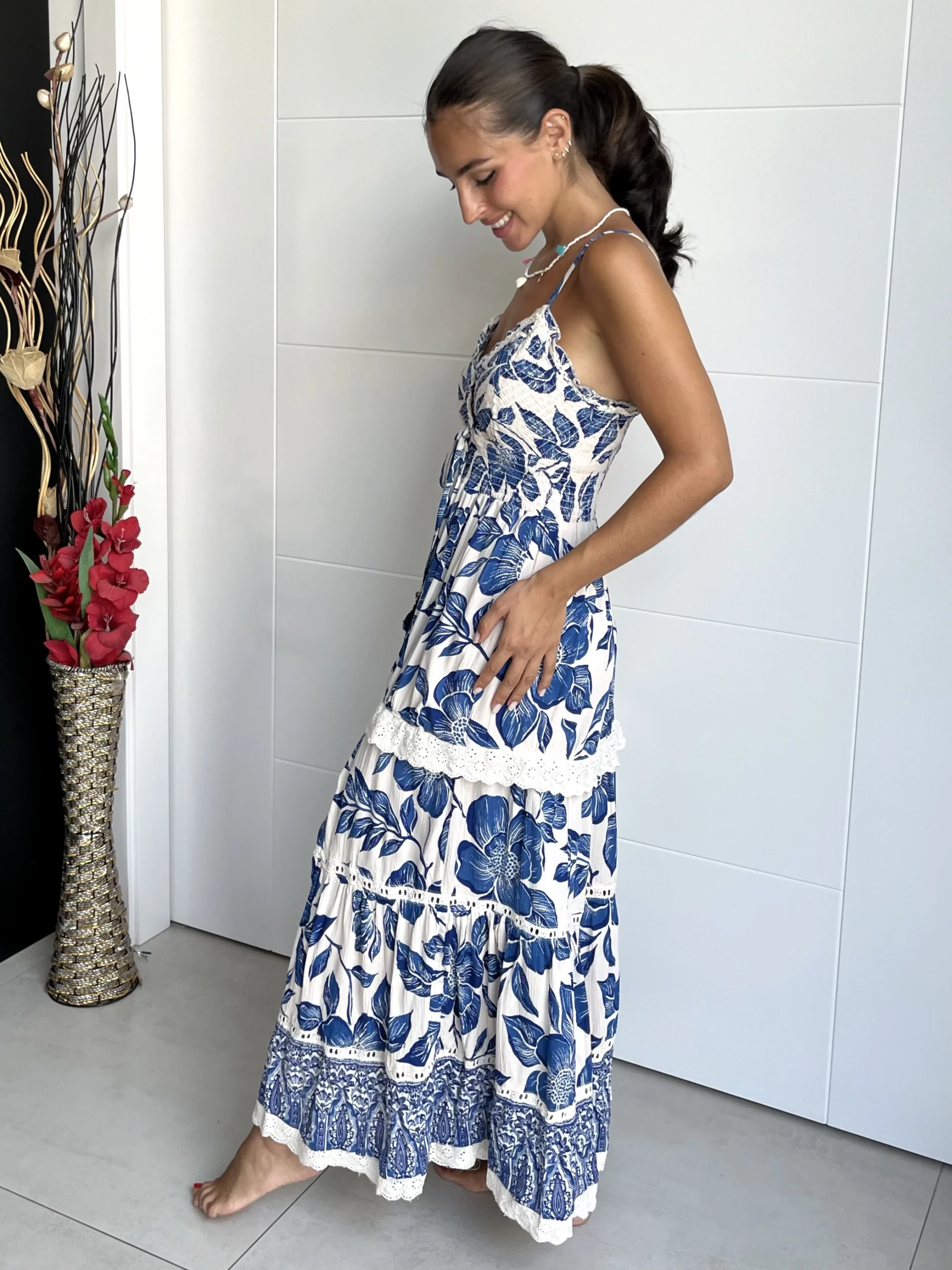 Vestido de playa con estilo India, con tirantes ajustables y escote en triángulo. Estampado de hojas en colores azul oscuro y blanco. Abertura en la falda. Volantes blancos en la falda. Cintura drapeada y cordón con lazada en la parte central. Vestido ancho, ligero y con vuelo. No tiene forro interior.