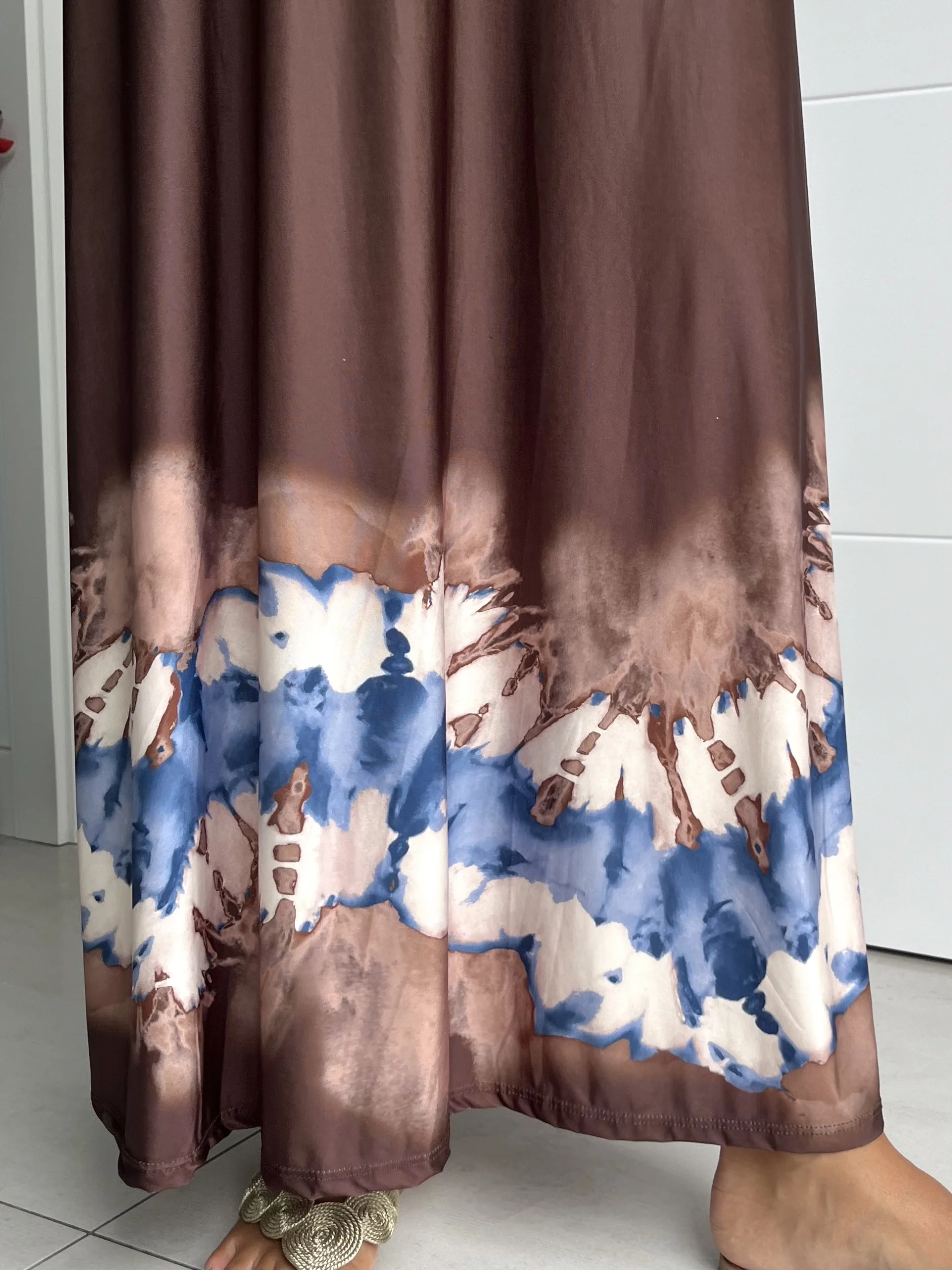 Vestido midi de seda fría marrón chocolate de tirantes y cuello redondo. Vestido con estampado en el pecho y en el acabado de la falda en colores azul y crudo. Forro interior en el pecho. Vestido con vuelo, caída evasé, ancho y no necesita plancha. Tela elástica.