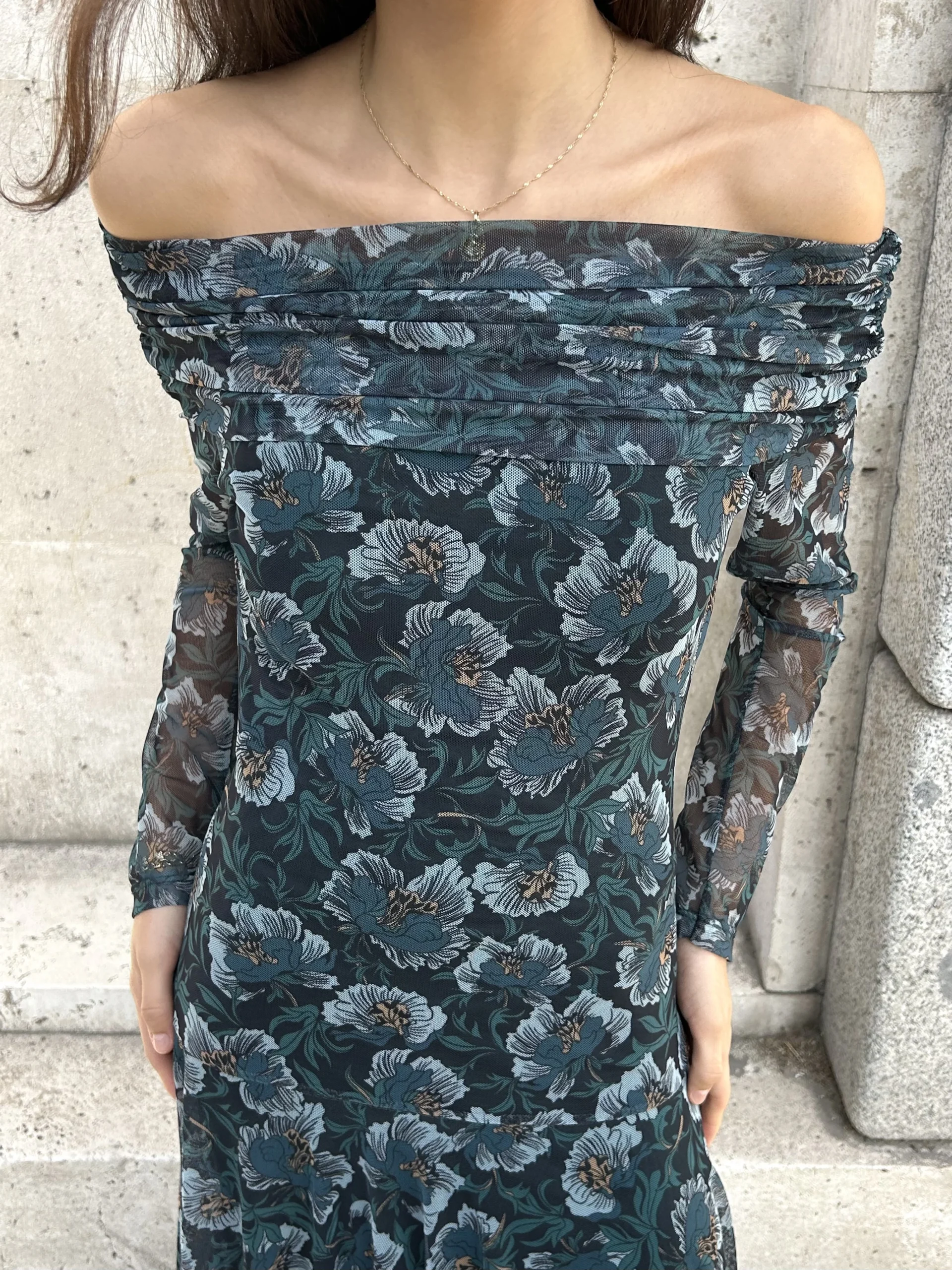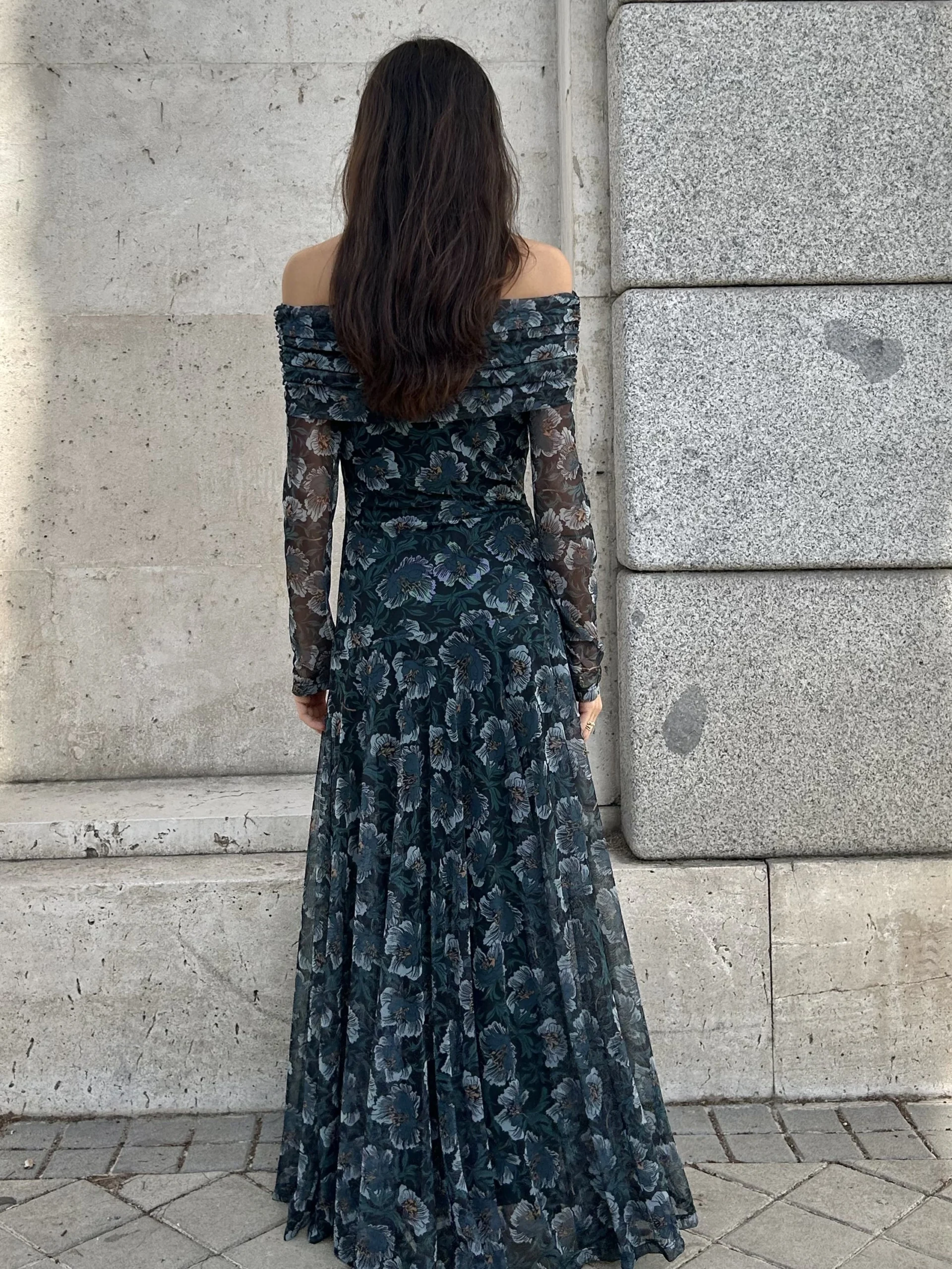 Vestido de tul largo color azul petróleo con estampado floral en tonos claros. Escote bardot, manga larga semi transparente, cintura elástica y forro interior.