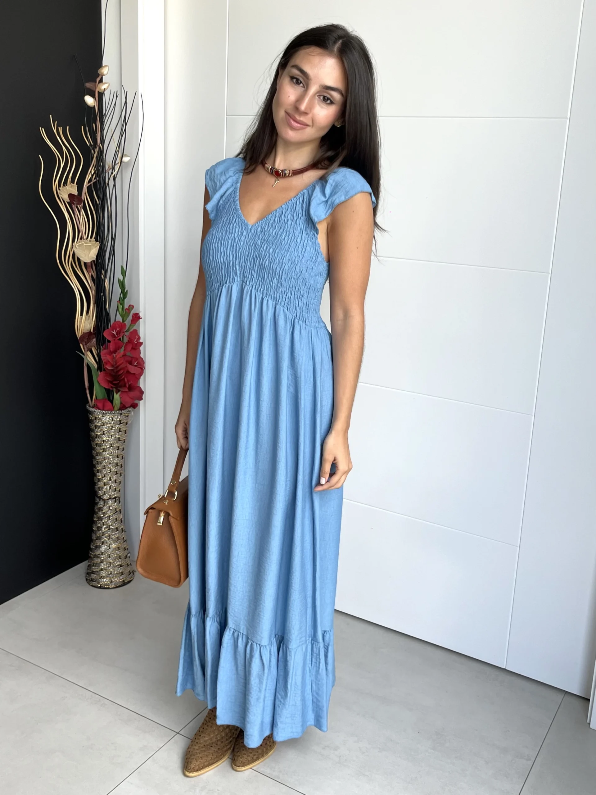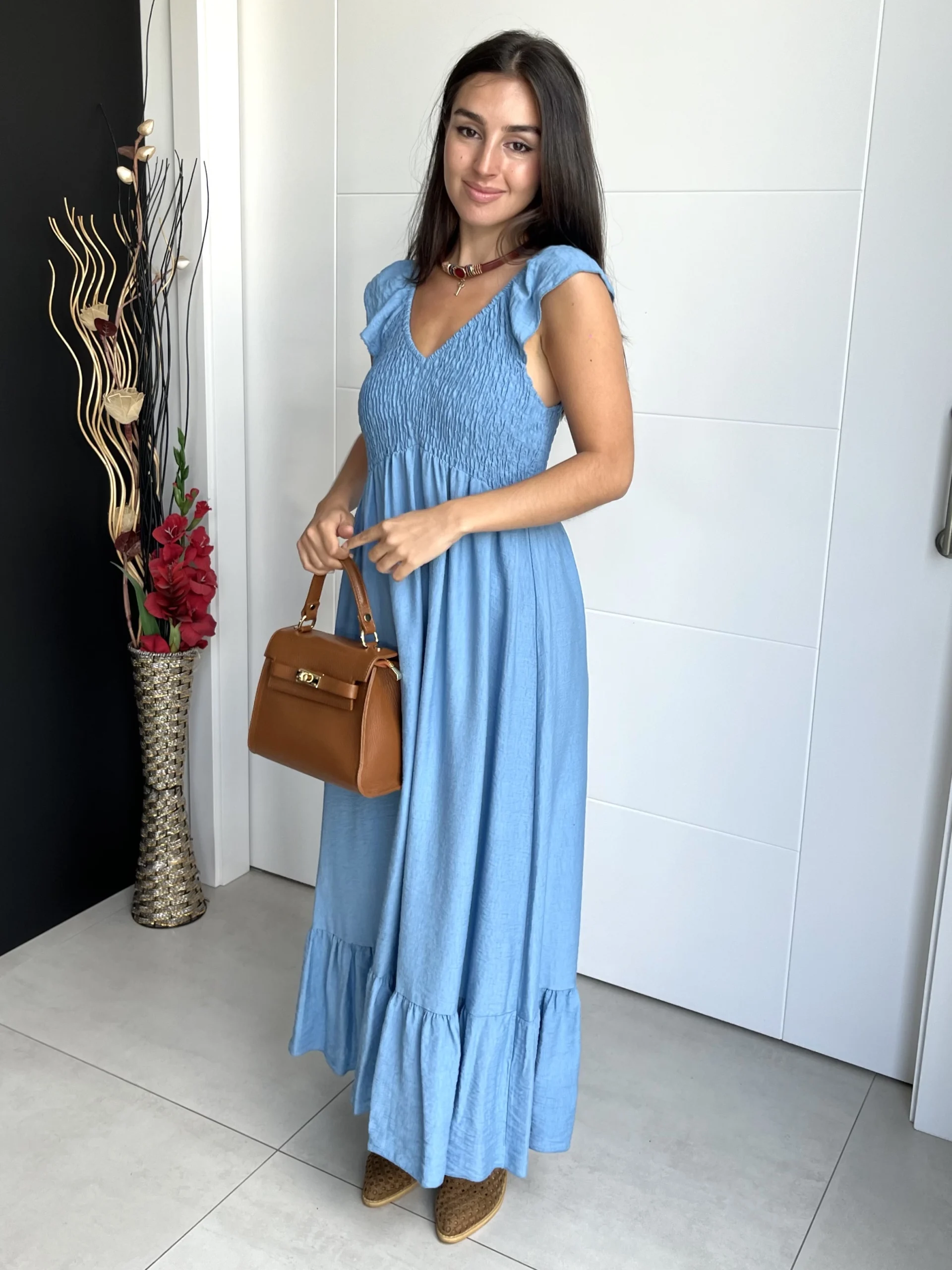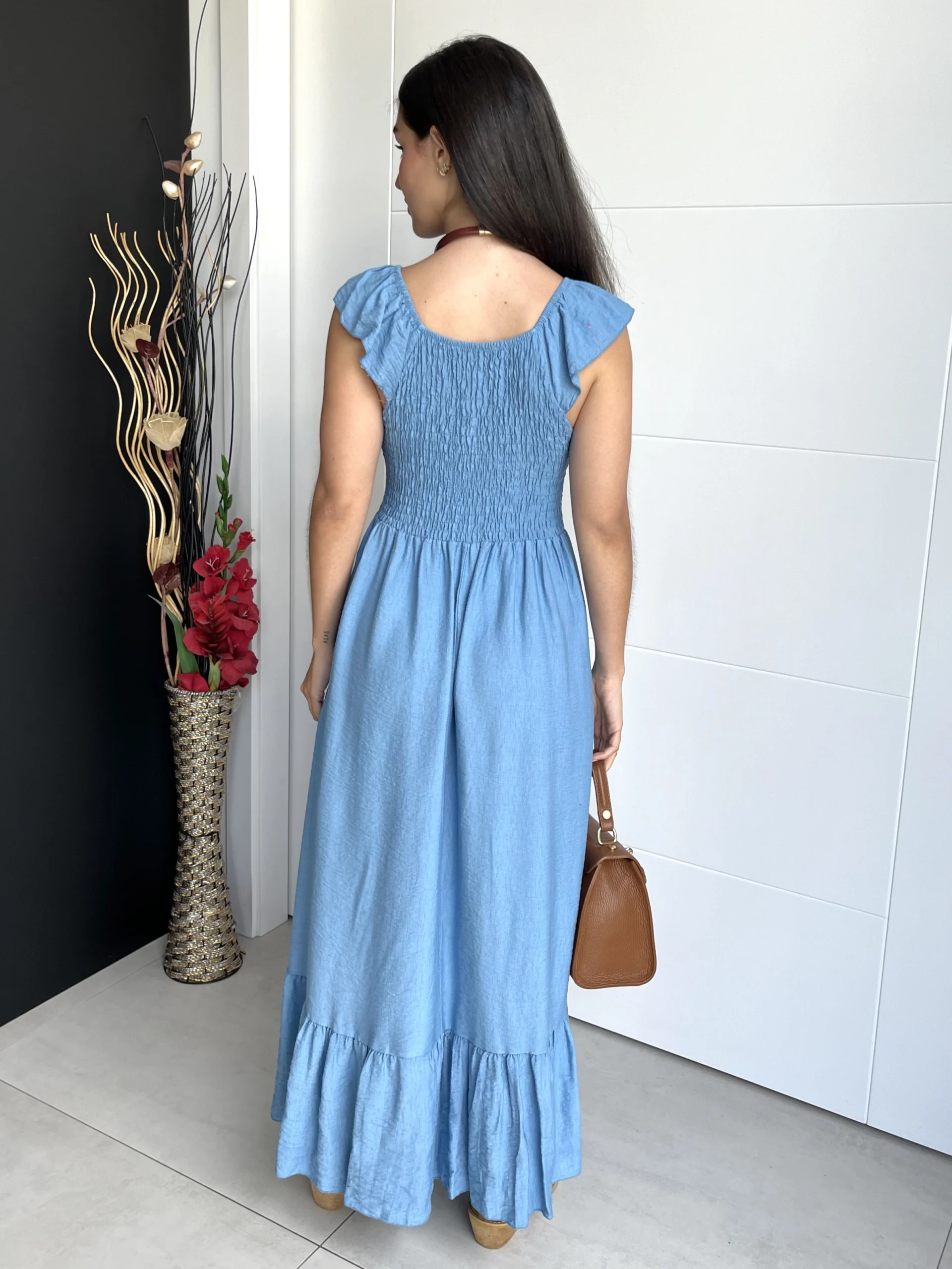 Vestido midi de tirantes en color azul. Con volantes en los tirantes y drapeado en el pecho y espalda. Escote en V. Vestido ligero, elástico y con vuelo.
