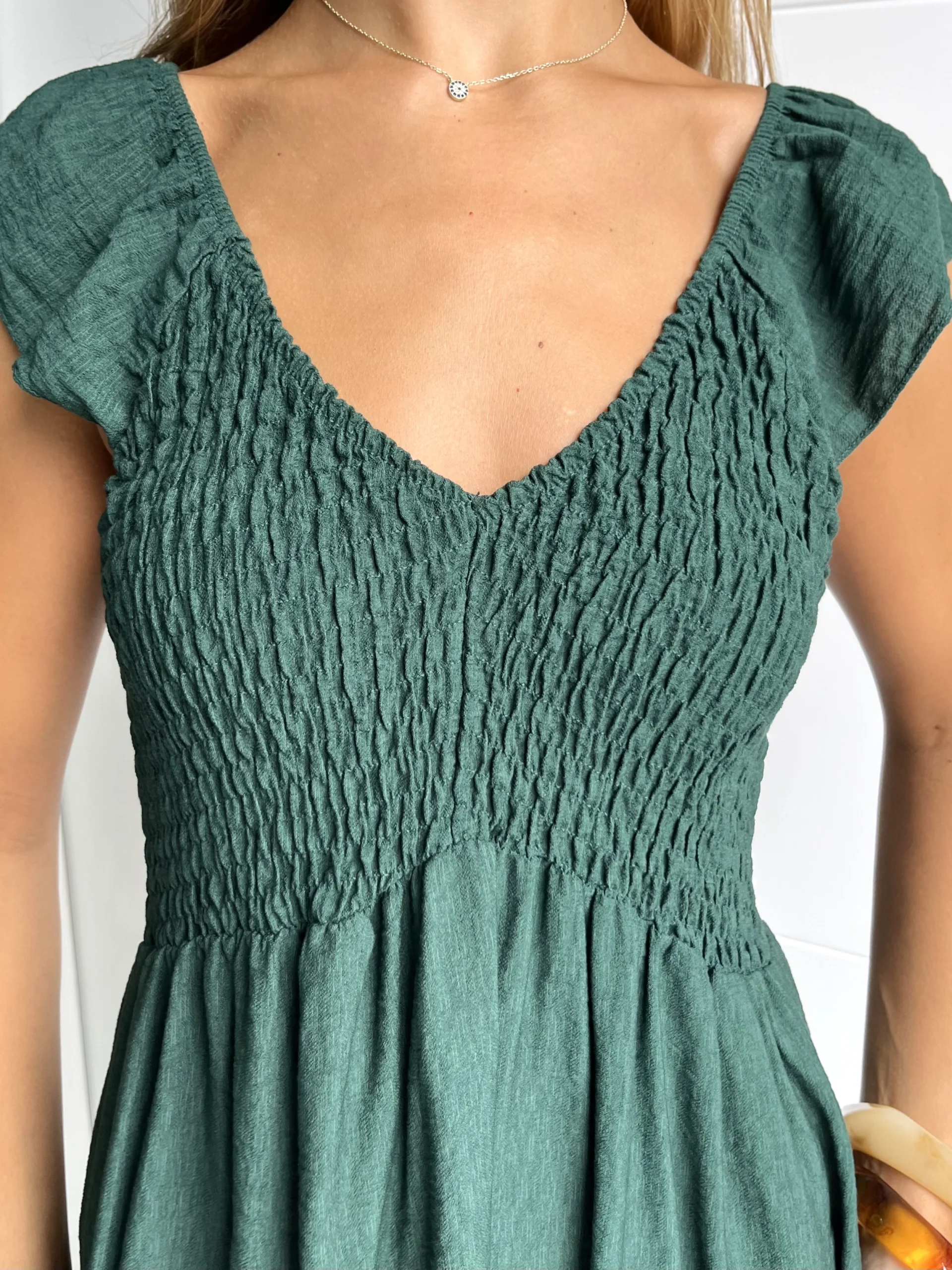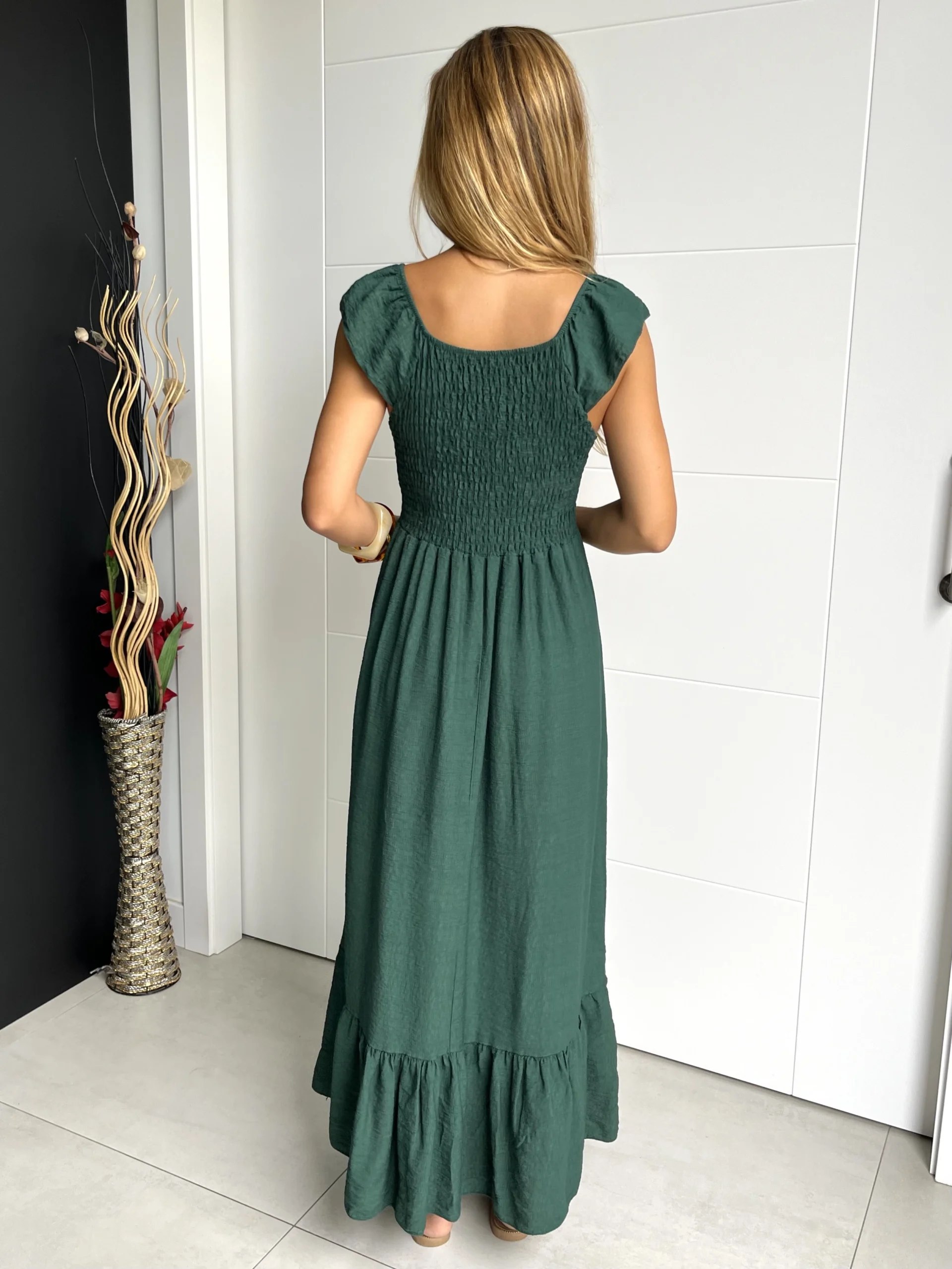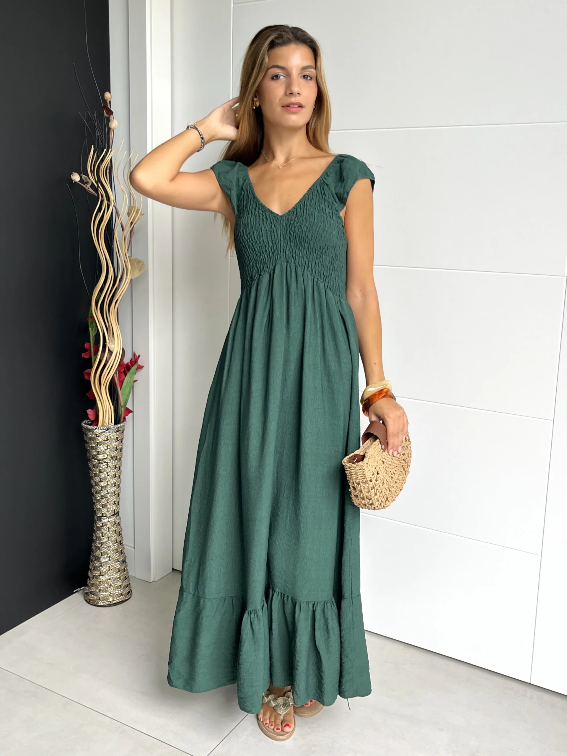 Vestido midi de tirantes en color verde botella. Con volantes en los tirantes y drapeado en el pecho y espalda. Escote en V. Vestido ligero, elástico y con vuelo.