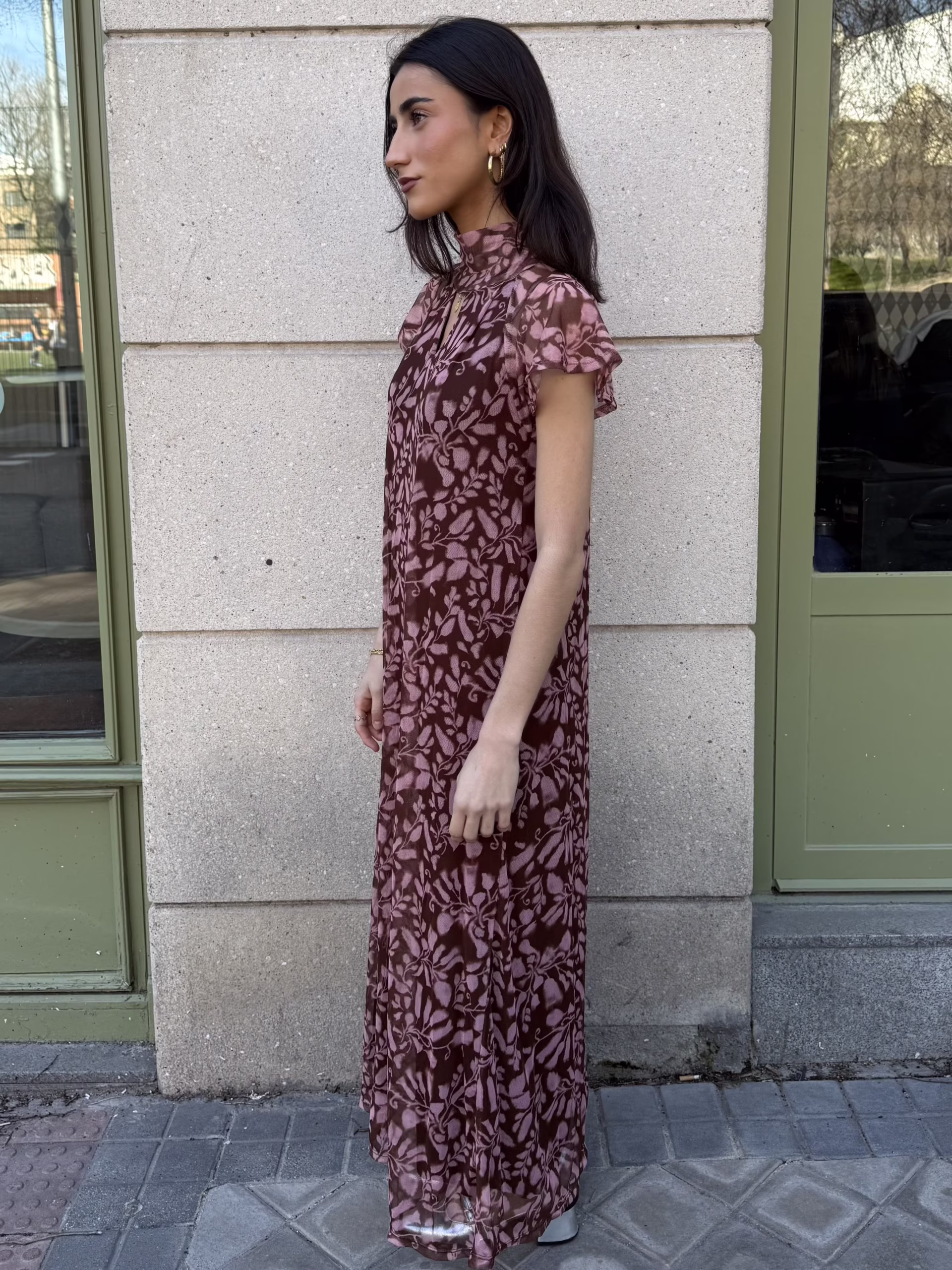 Vestido largo de tul estampado floral en tono marrón chocolate con motivo en rosa empolvado. Cuello ligeramente subido con abertura frontal en lágrima. Manga corta con pequeño volante. Corte recto fluido con caída ligera. Tejido vaporoso y semitransparente. Forro interior a tono.